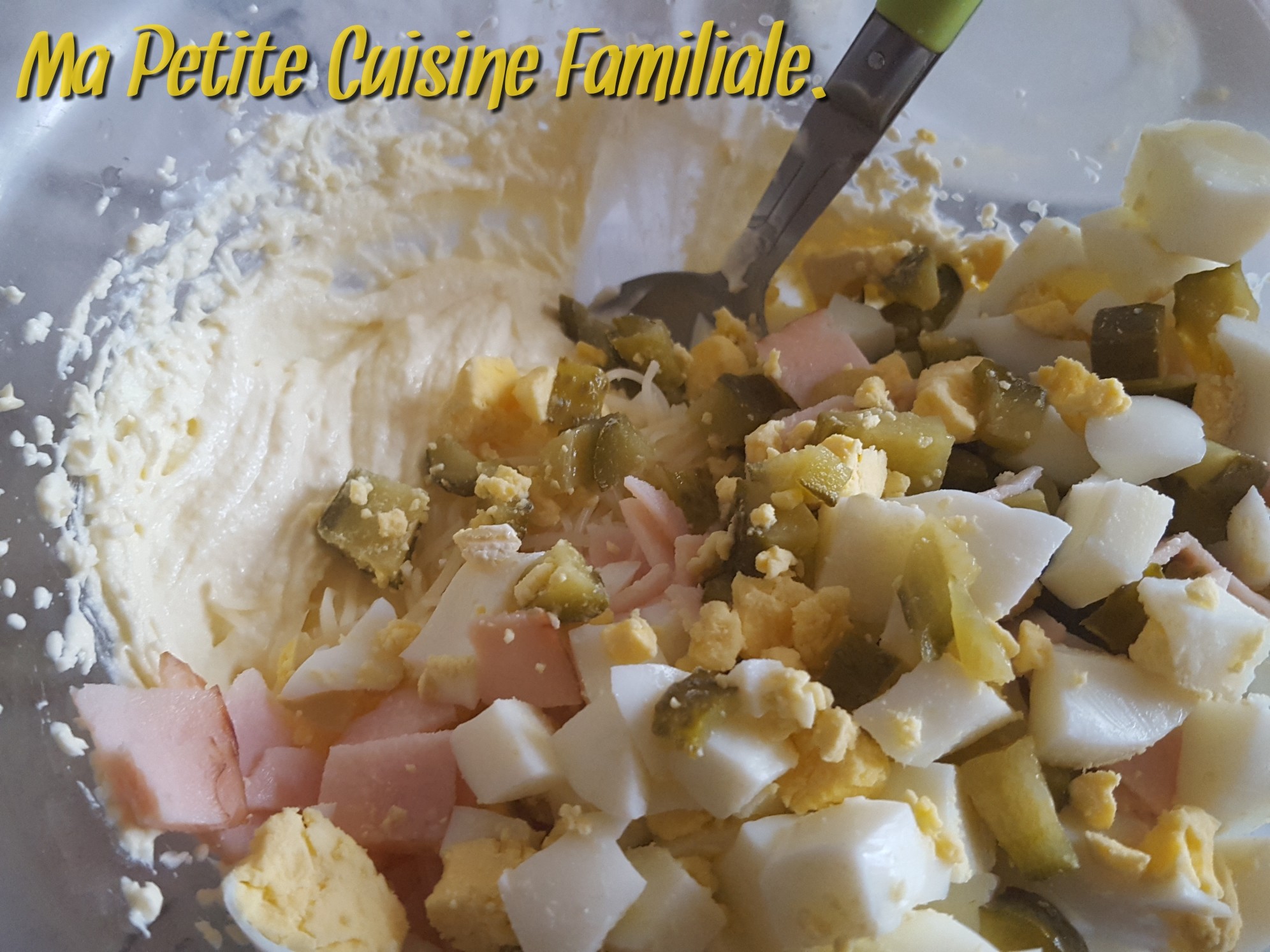 3. Mélangez les cornichons, les oeufs durs, le jambon et le gruyère râpé à la crème. Réservez.