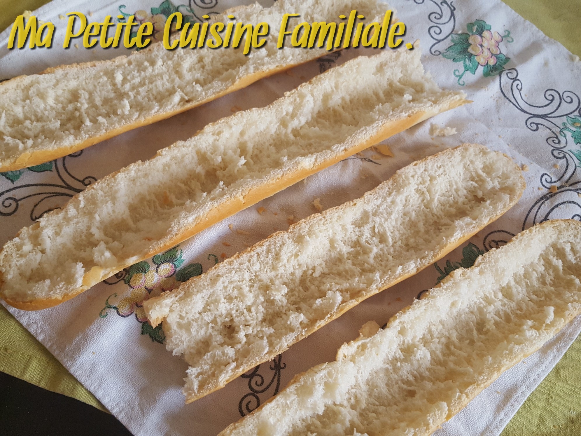 4. Coupez la baguettes en 2 dans la longueur. J’ai également choisi de la couper en 2 pour en faire 2 demis baguettes. (Plus simple pour enfourner) Retirez la mie.