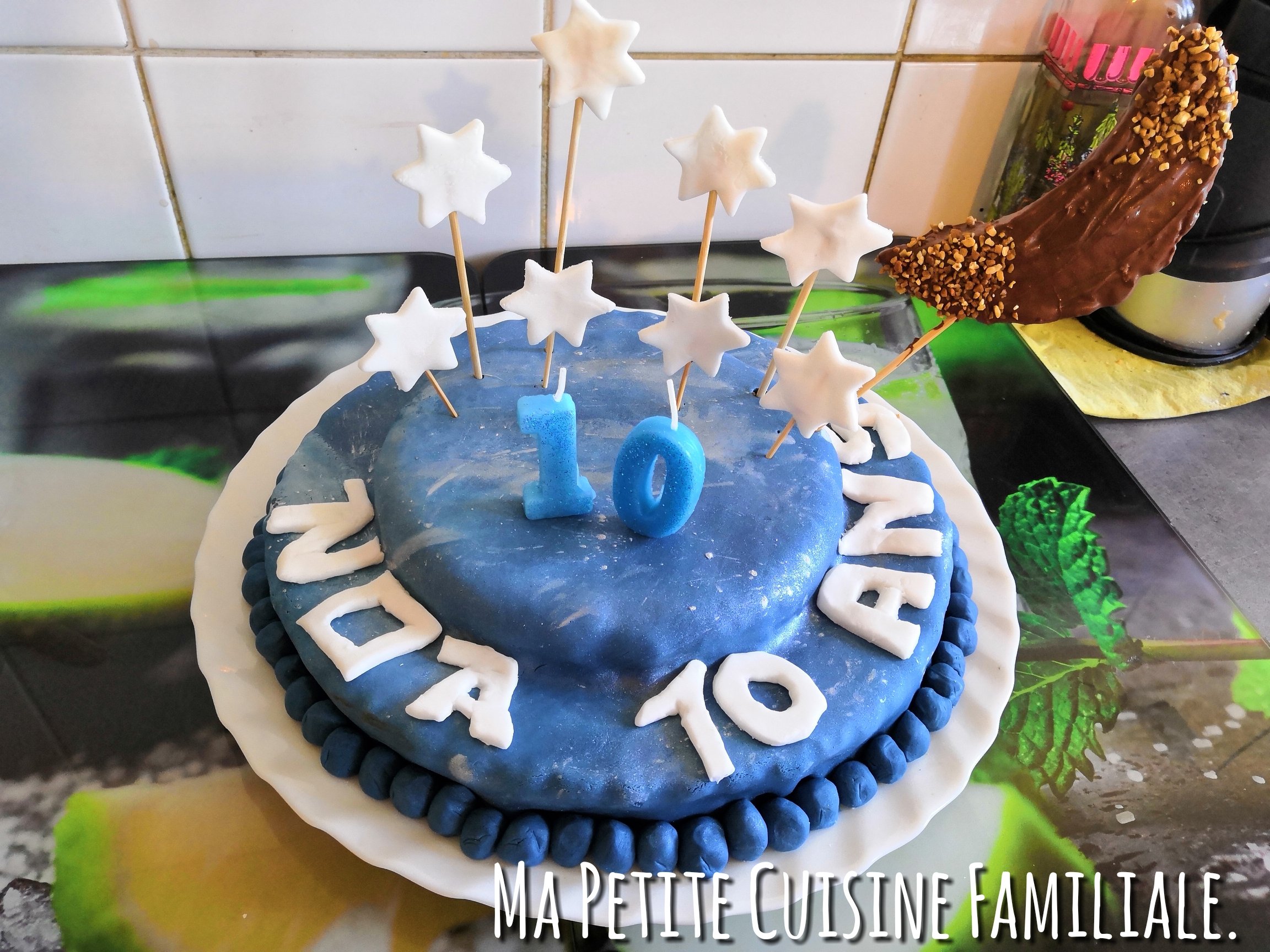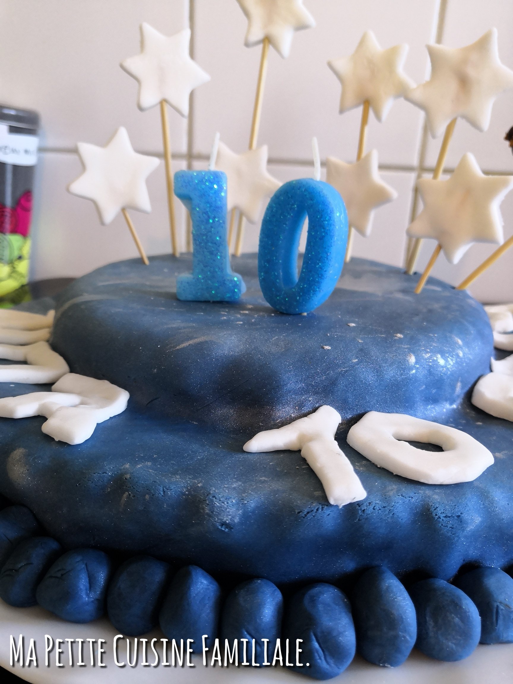Ce premier gâteau est sur le thème de l’espace. L’intérieur, est fait de fonds de tartes tout prêt. (oui, vous allez me dire, encore de l’industriel, mais ce sont des fonds qui traînaient chez moi et qu’on m’avait donné, je ne voulais pas les gâcher.) et de 2 mousses au chocolat, une au chocolat noir et l’autre à la pralinoise.