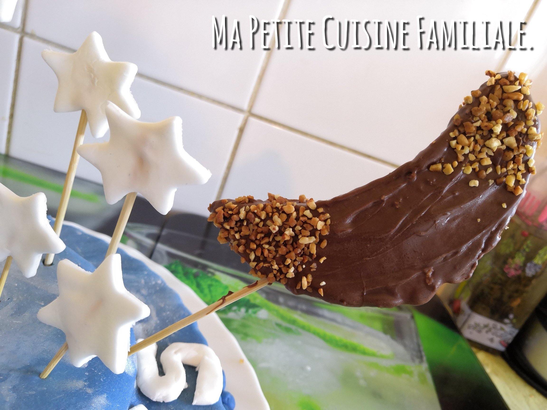 L’extérieur est composé de pâte à sucre que j’ai marbré, ainsi que de paillettes argentées alimentaires. Les étoiles sont en pâte à sucre blanche aromatisée coco et la lune est simplement faite d’une chute de biscuit enrobée de chocolat noir et saupoudrée de pralin à ses extrémités.
