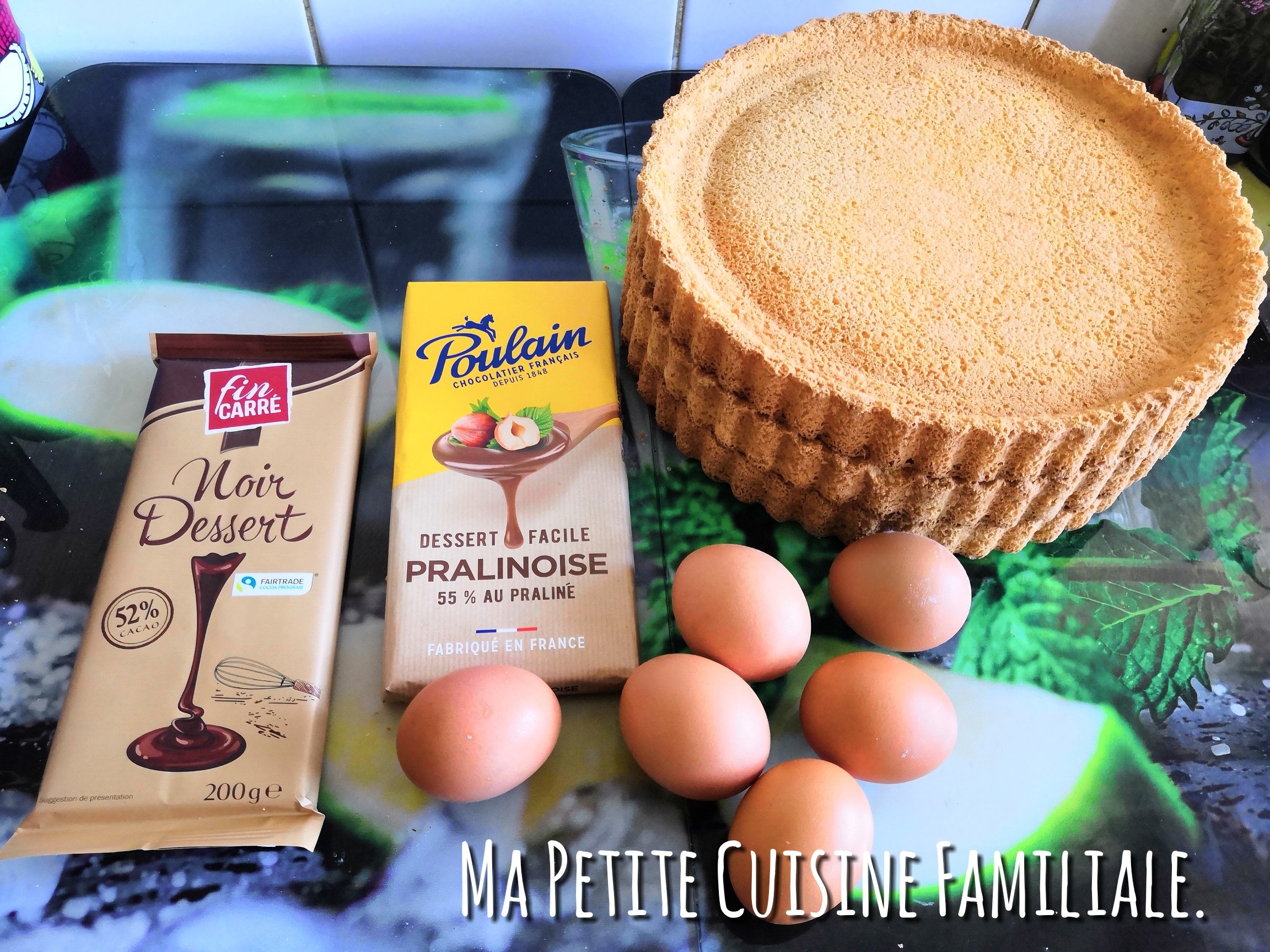 3. Coupez 2 fonds de tartes en 2, dans le sens horizontal. Posez un morceau sur un plat et garnissez-le de la mousse au chocolat noir. Puis posez un fond de tarte sur le premier, que vous garnirez aussi de mousse pralinoise. Posez un 3e morceau de fond de tarte sur le dessus .
