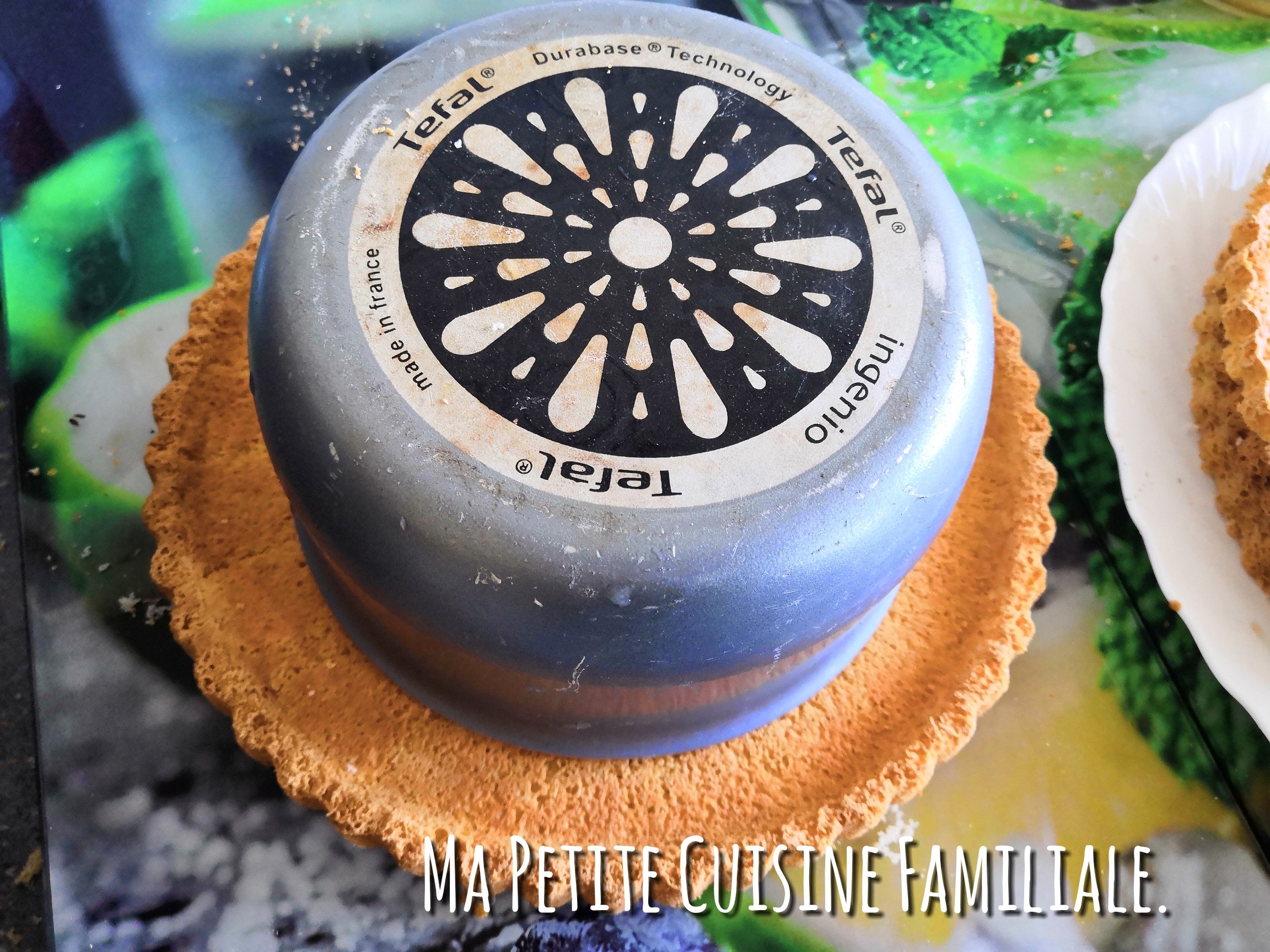 4. À l’aide d’une petite casserole ou d’un cercle découpez un plus petit rond dans le fond de tarte restant. Et posez le sur le gâteau . Pour qu’il tienne, j’avais encore recouvert le haut du gâteau avec de la mousse pralinoise.
