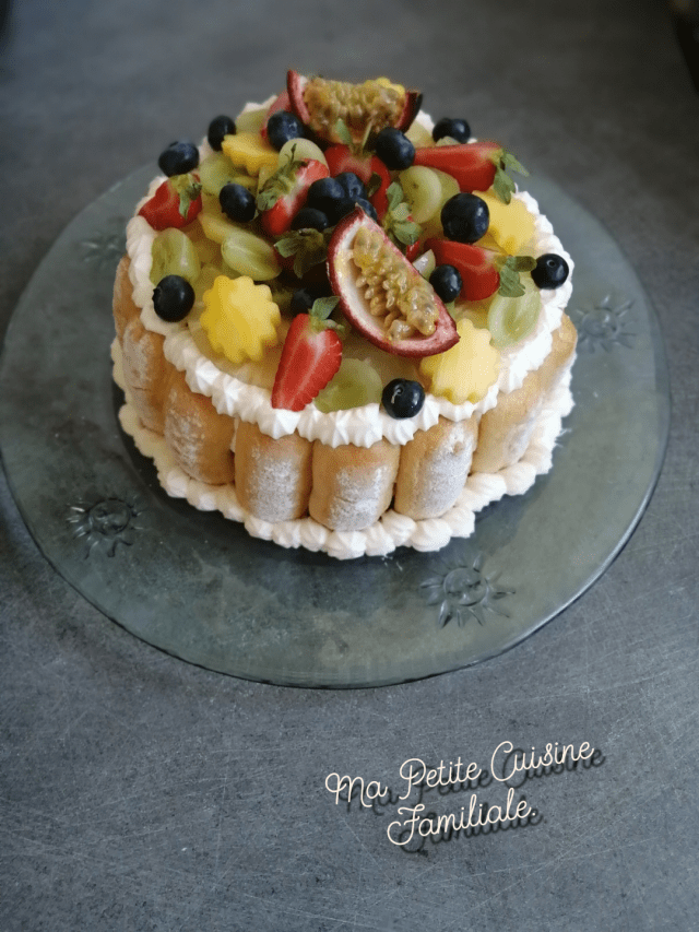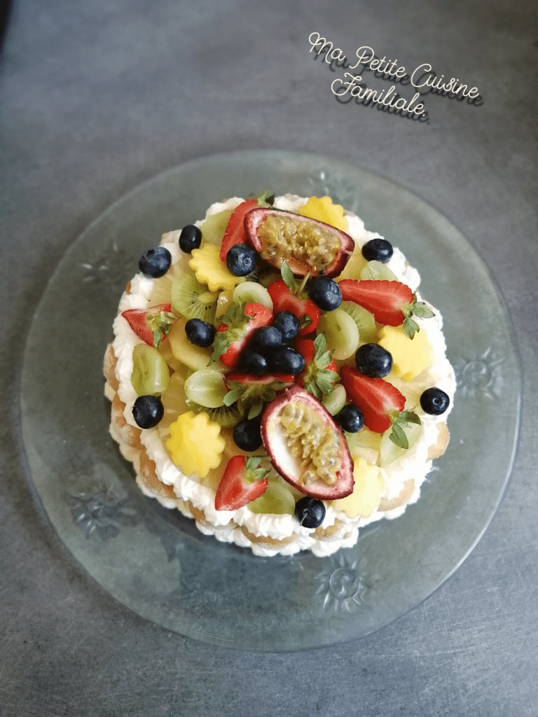 Je l’ai orné de beaux fruits. Ananas, kiwi, mangue, raisin, myrtilles, fraises et fruit de la passion. N’est-elle pas belle cette charlotte. Eh oui ! Effet whaou garanti ! J’ai également caché des morceaux de fruits à l’intérieur.
