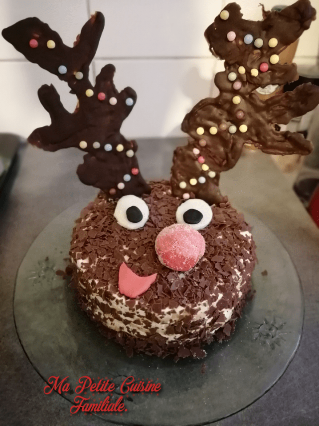 Son gâteau, je l’ai voulu à son image, original, fantastique, amusant, plein de rires et de joie, généreux et gourmand. Tout mon fils du haut de ses 5 ans. Et je l’ai choisi tout en simplicité, une génoise garnie de crème et de framboises. Un biscuit recouvert de crème et de copeaux de chocolat pour donner sa couleur brune au renne. Les yeux, le nez et la bouche en pâte à sucre tout de même. Les bois, je les ai dessiné au chocolat noir sur lesquels j’ai collé de petits bonbons chocolatés multicolores pour rappeler, le renne du dessin animé qu’il aime bien: « l’apprenti du Père-Noël », qui a des guirlandes lumineuses accrochées à ses bois.