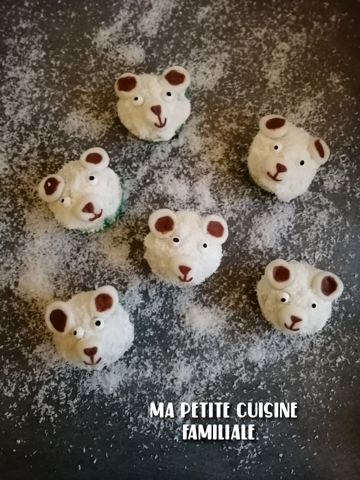 L’article sur le gâteau arrive, mais je voulais l’accompagner de petites choses à grignoter comme ces cupcakes ours polaires qui ont fait l’unanimité auprès des mes enfants.