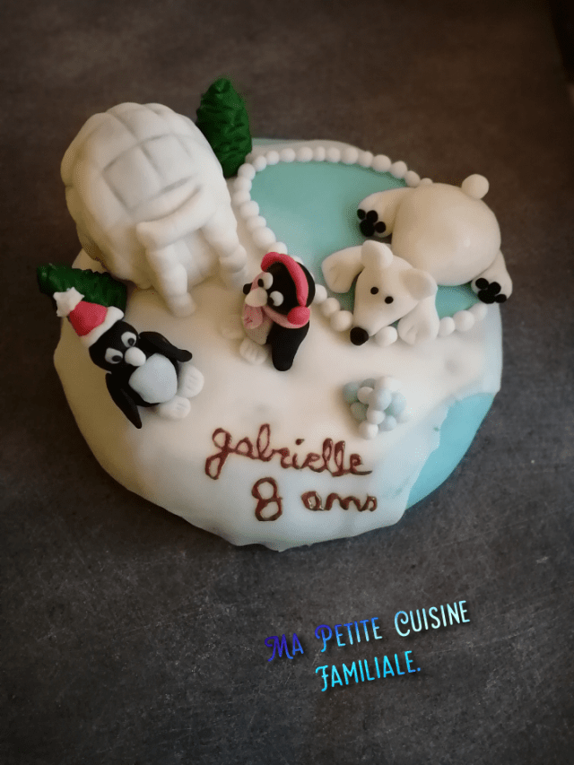 Pour son anniversaire, je souhaitais lui reproduire un pôle nord enfantin, avec des pingouins, un ours polaire, un igloo (elle y tenait à son igloo…) . Le bleu et le blanc devaient rester les couleurs principales du gâteau. Niveau goût, elle n’avait pas d’exigences mais ne souhaitait pas de chocolat. Vanille était le mot d’ordre principal. J’avais donc carte blanche.