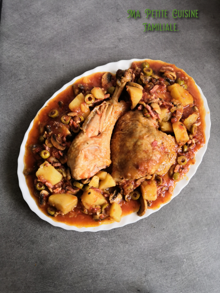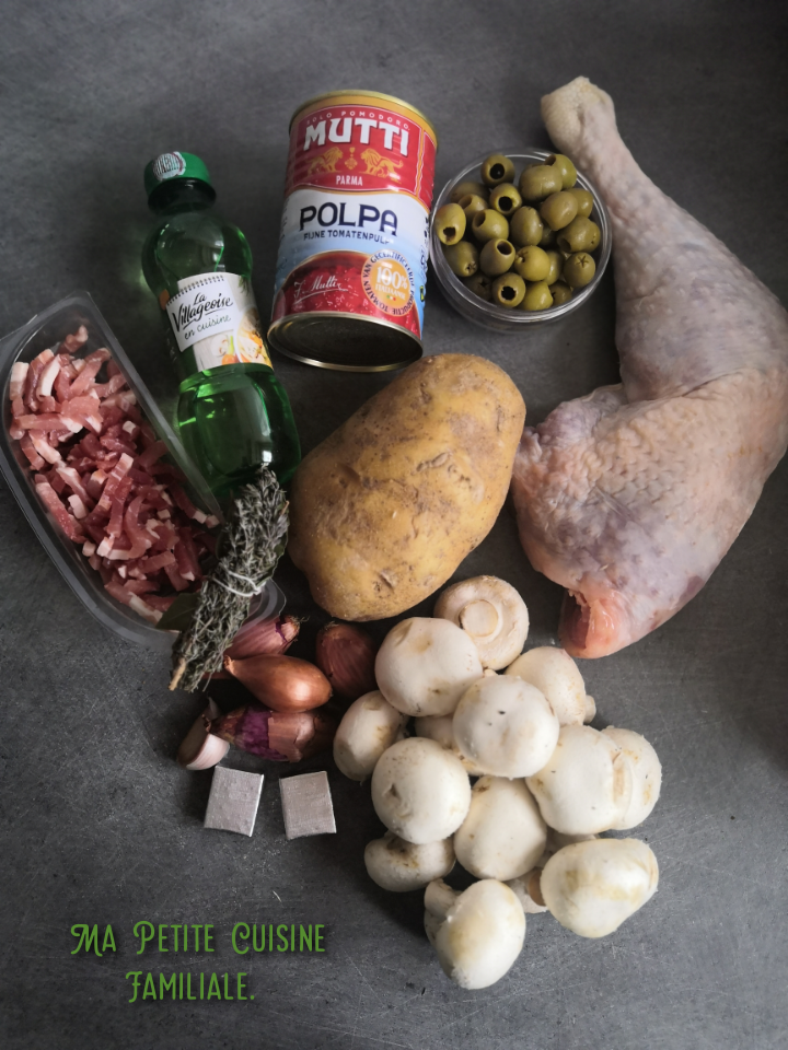 Il me restait quelques olives vertes ouvertes pour les apéros des fêtes de fin d’année, j’en ai profité pour les glisser dans le plat, d’où l’appellation « Marengo ». Une viande marengo est cuisinée avec des olives vertes.