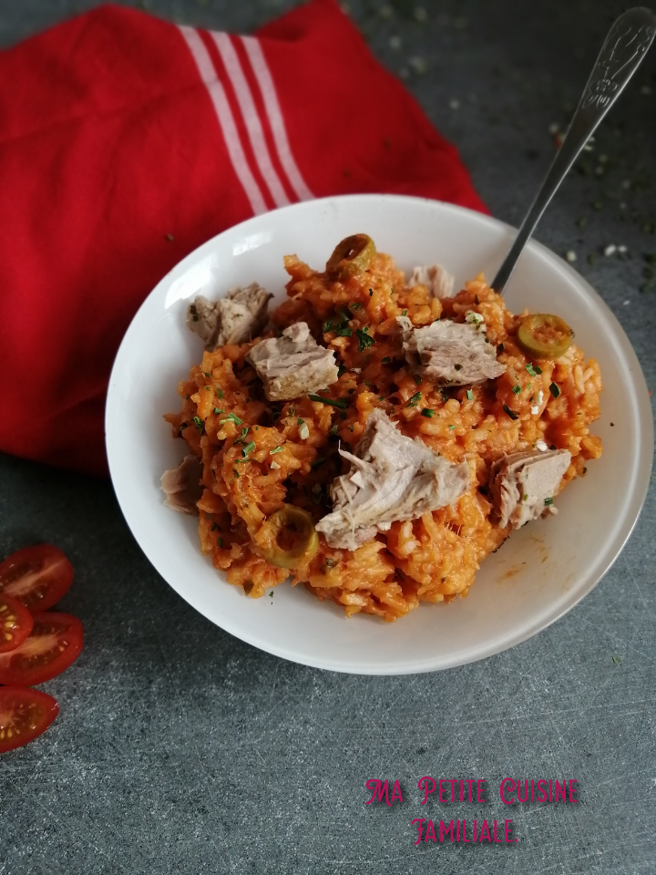 Au riz, ajoutez le thon en morceaux, les olives en rondelles et 1/4 du bouillon de tomate. Mélangez.