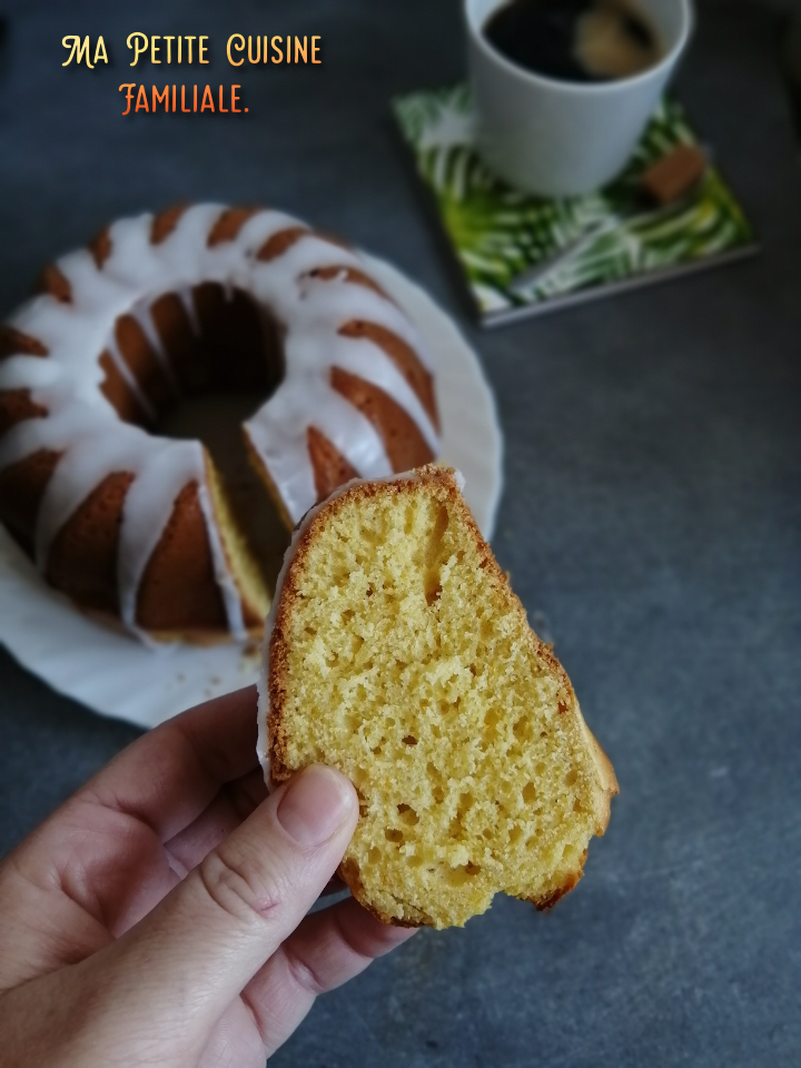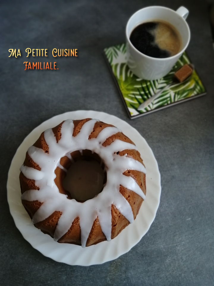 Bon vous l’aurez comprit, c’est un gâteau couronne. Les fabriquants de moules rivalisent d’ingéniosité et d’esthétique pour les moules à bundt cake. Il y en a tellement et des splendides ! Moi je n’ai que mon moule à kougelhopf qui fait très bien l’affaire pour ce genre de gâteau.