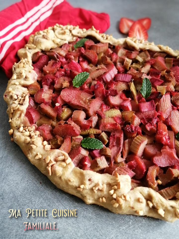 Aujourd’hui, je ne suis pas très originale car je vous présente une tarte. J’y ai associé la rhubarbe et la fraise. Ce qui donne un mélange très gourmand. Tarte rustique, évidemment. J’aime tellement les tartes rustiques, on étale la pâte, on garnit de fruits et on rabat les bords. Rien de plus simple. Et esthétiquement, j’adore les tartes rustiques, je trouve qu’elles présentent bien sur une table pour le dessert ou le goûter.