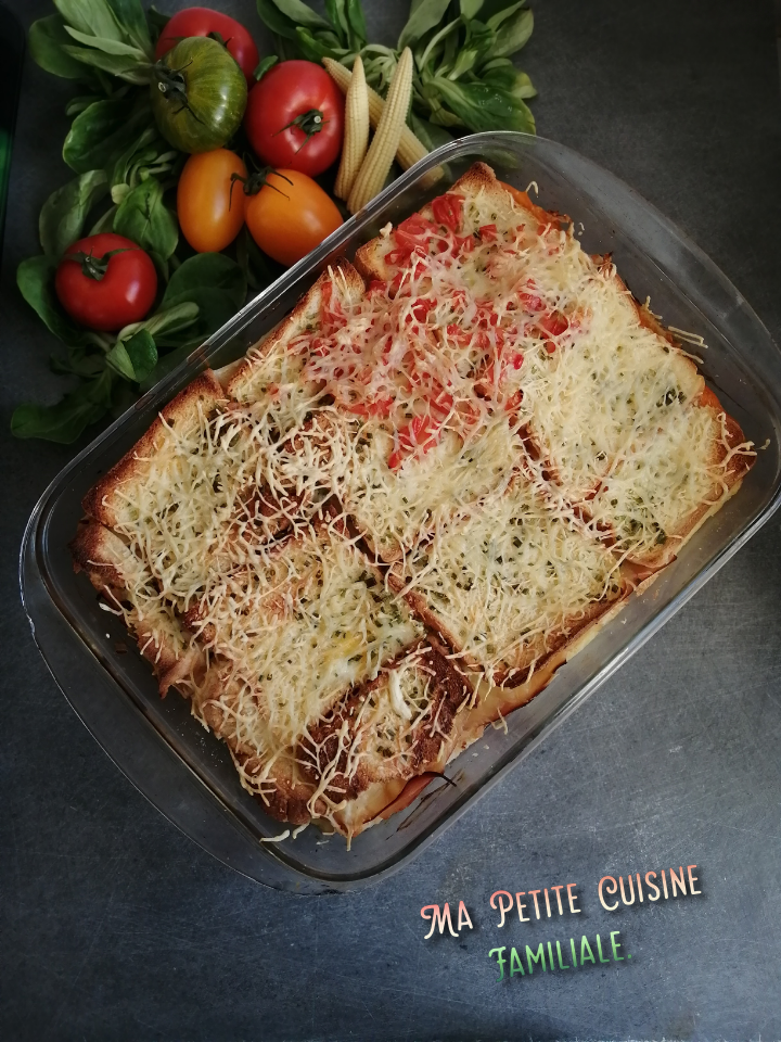 - Légumes au choix. Pour cette fois je n’ai utilisé que des tomates. À l’intérieur je les ai coupé en rondelles et sur le dessus en petits dés. Je n’en ai pas mit partout car les enfants n’aiment pas. Parfois je rajoute courgettes, en tranches très fines, poireaux, champignons…