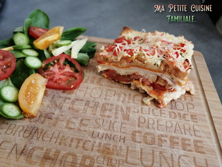 La méthode, reste la même que le croque monsieur traditionnel, du pain de mie, un reste de charcuterie ou autre, des légumes et du fromage !