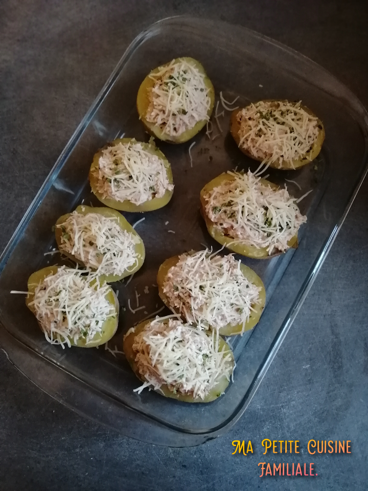 À l’aide d’une cuillère à soupe, remplissez les coques de pommes de terre de la farce au thon. Et saupoudrez de gruyère râpé.