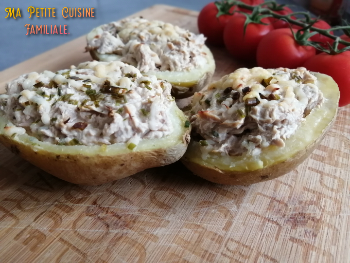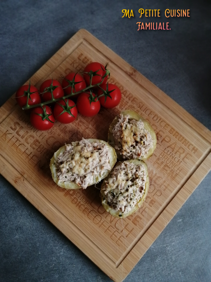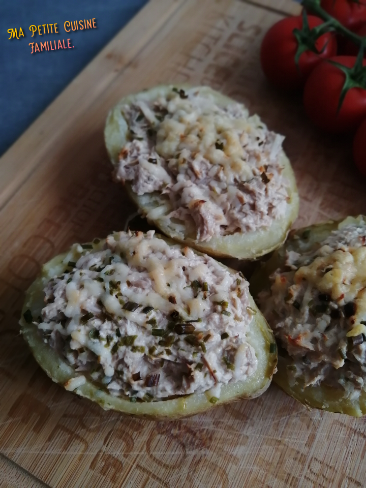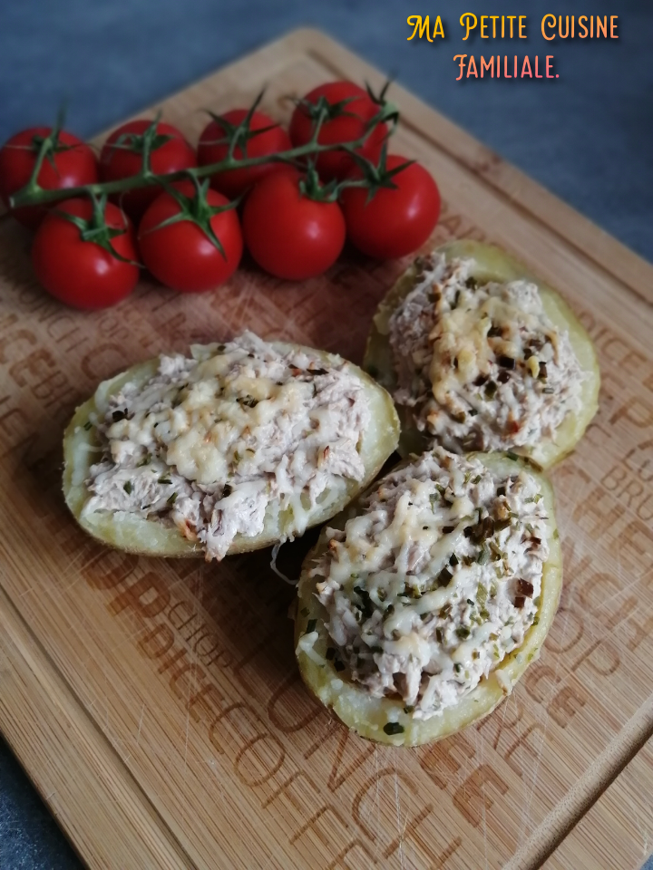 C’est ainsi que j’ai découvert cette recette super bonne. Nous étions déjà fans des pommes de terre farcies à la viande hachée mais là, avec le thon, c’est juste délicieux. Ça change et servies avec des crudités, ces pommes de terre sont un plat bien complet.