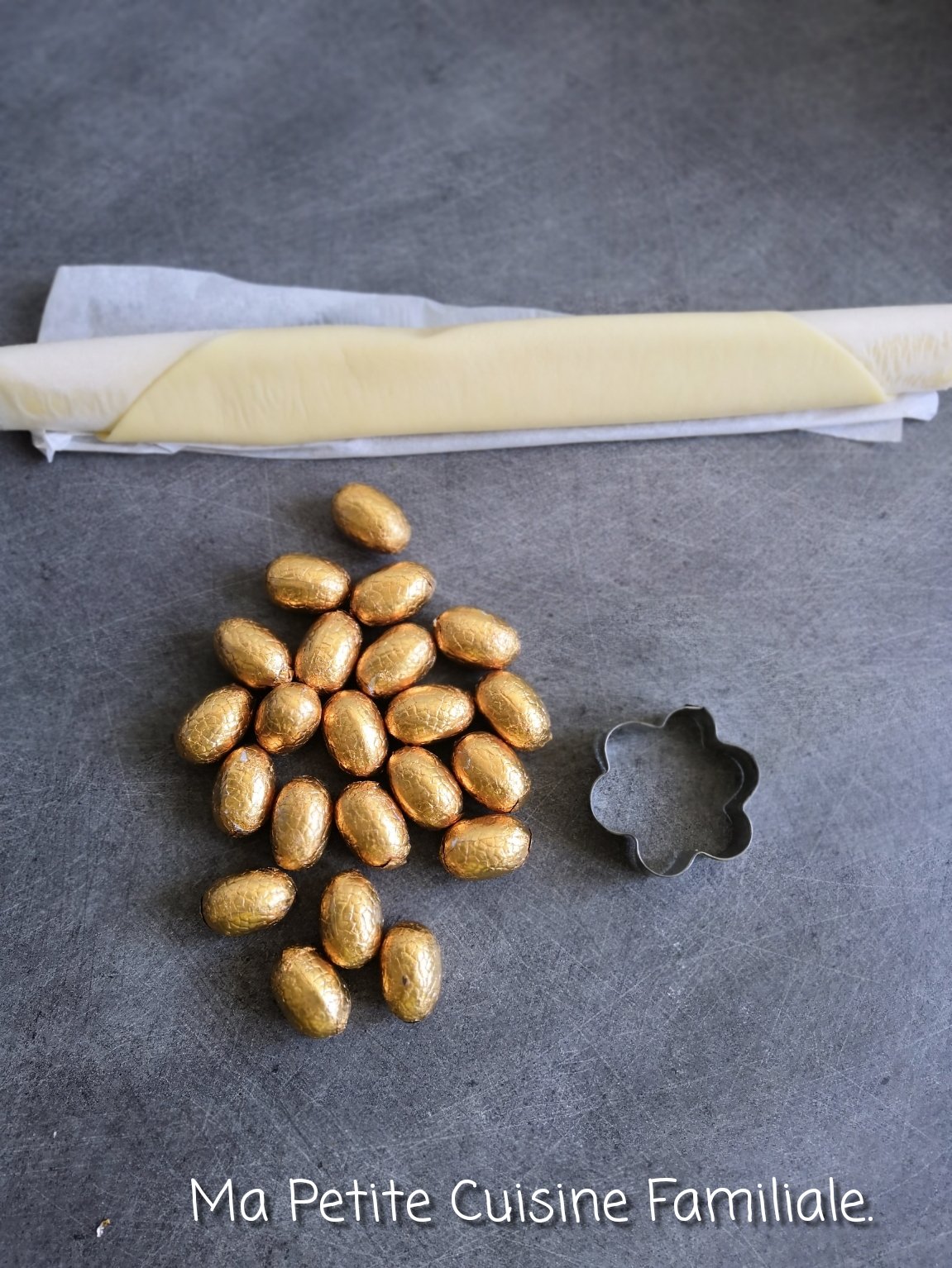 Une pâte brisée, des petits oeufs en chocolat fourrés praliné, un peu d’eau, de la cassonade et le tour est joué. Une belle petite gourmandise d’après Pâques à déguster avec un thé ou un café.
