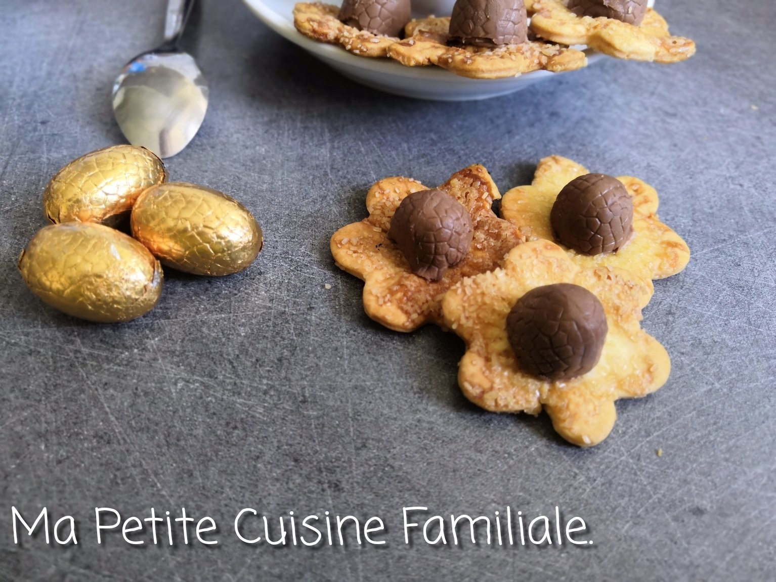 Pendant la cuisson, coupez les oeufs en chocolat en 2. Laissez tiédir les biscuits. Puis, collez un demi oeuf sur le centre de chaque biscuit. Comme le biscuit est encore tiède, le chocolat va un peu fondre puis coller au gâteau en refroidissant.