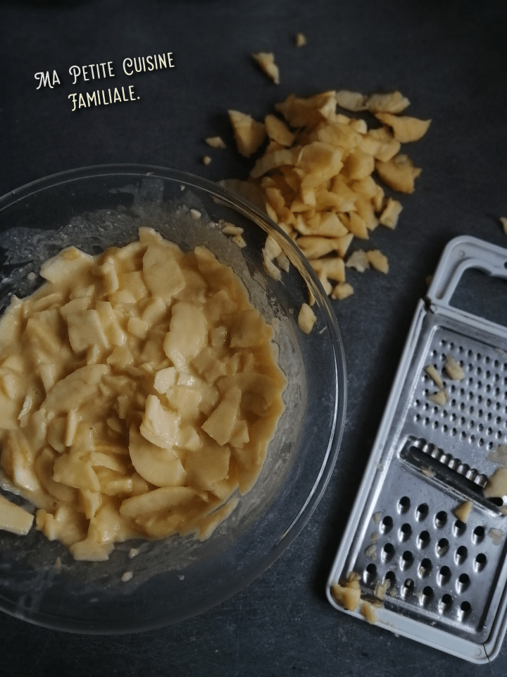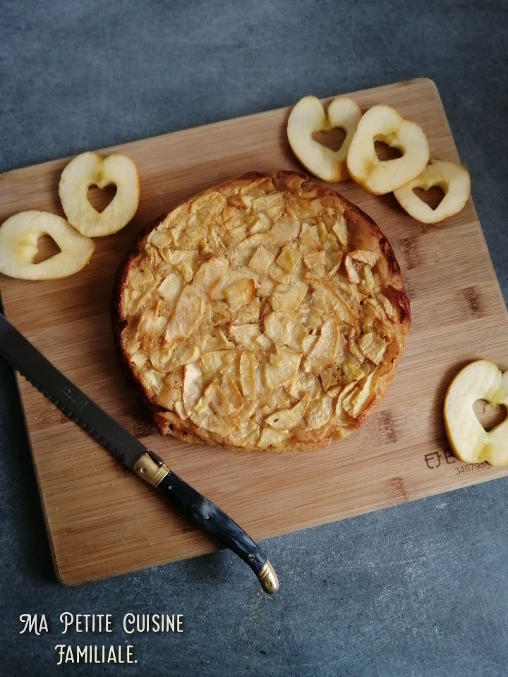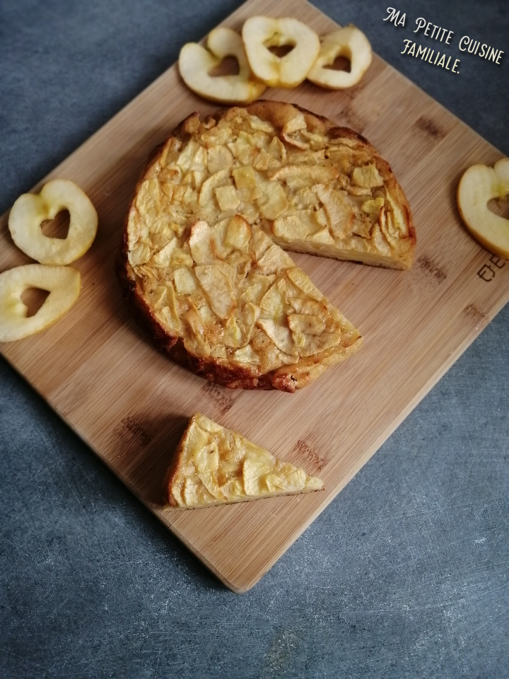 Il est très facile à faire, le plus long reste de couper les pommes en lamelles très fines. C’est une espèce de crêpe géante qui me permet d’écouler les pommes un peu fripées qui traînent dans la corbeille de fruits. Une recette anti-gaspi, évidemment.