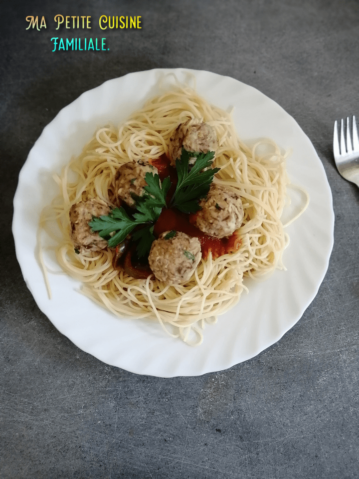 J’ai servi mes boulettes avec des spaghettis, évidement. Si vous êtes prêts à cuisiner, passons à la recette !