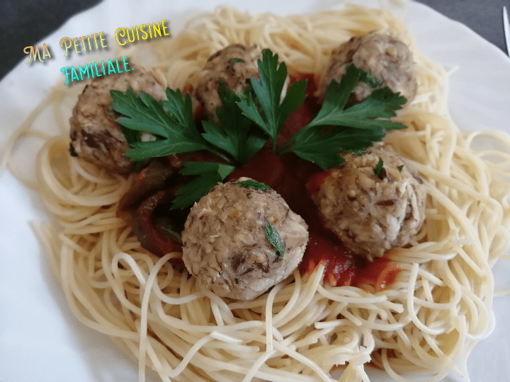 Pour sortir de la routine des spaghettis/boulettes au fromage, j’ai choisi de faire des boulettes au maquereau, accompagnées d’une petite sauce tomate au poivron.