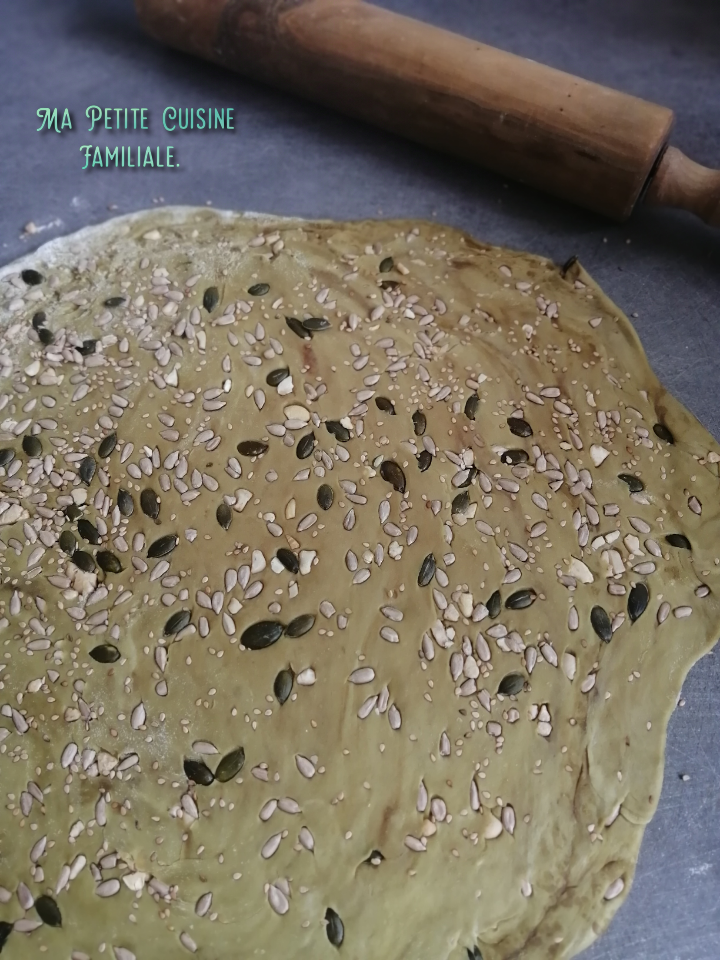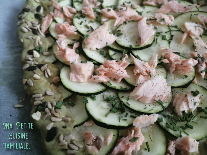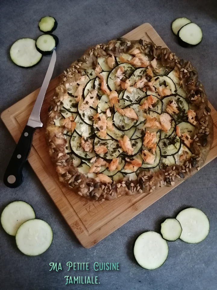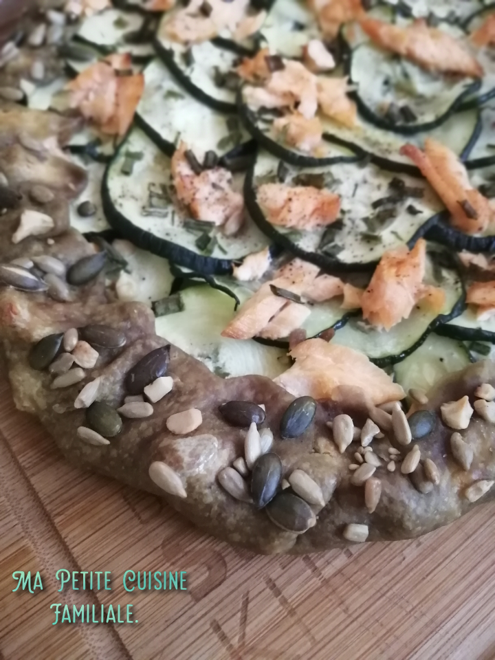 Là j’avais envie d’une bonne tarte rustique courgette/saumon. Une pâte faite maison, avec quelques graines de tournesol et de courge à l’huile de graines de courge de Syrie. Une huile au bon goût torréfié et qui apporte une petite couleur verte à la pâte.