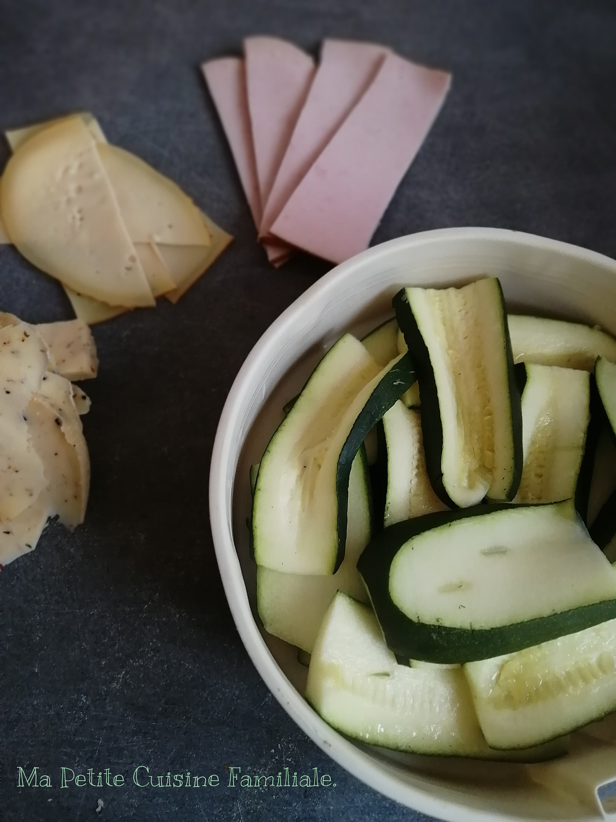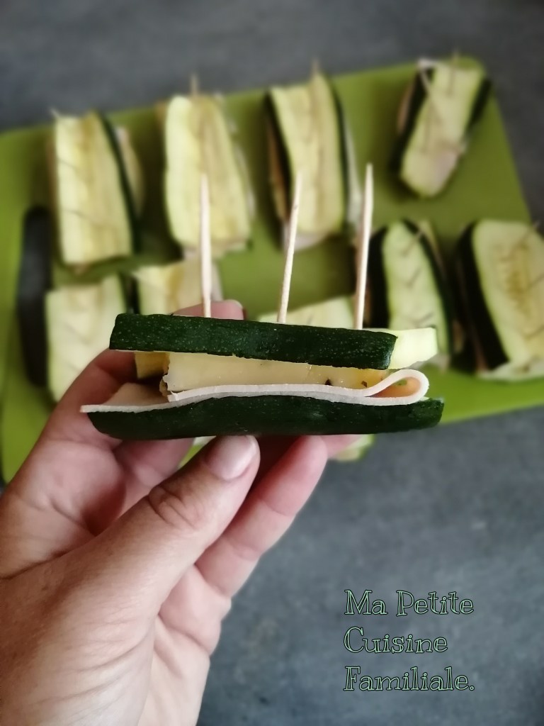 Posez 1 tranche de courgette, 1 ou 2 tranches de jambon et de fromage et recouvrez d’une tranche de courgette. En gros, c’est un sandwich.
