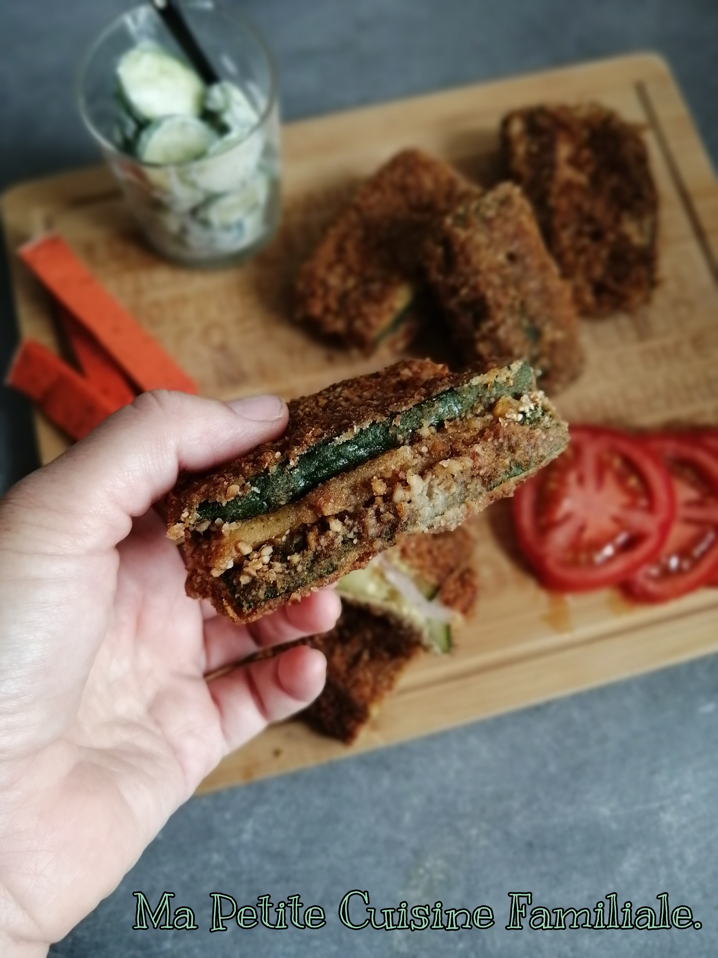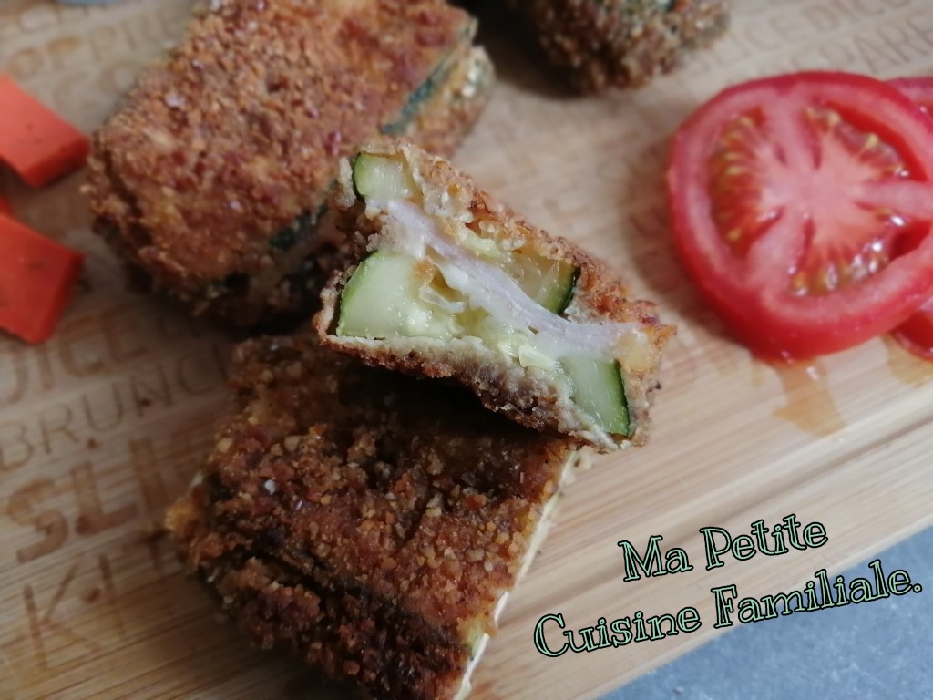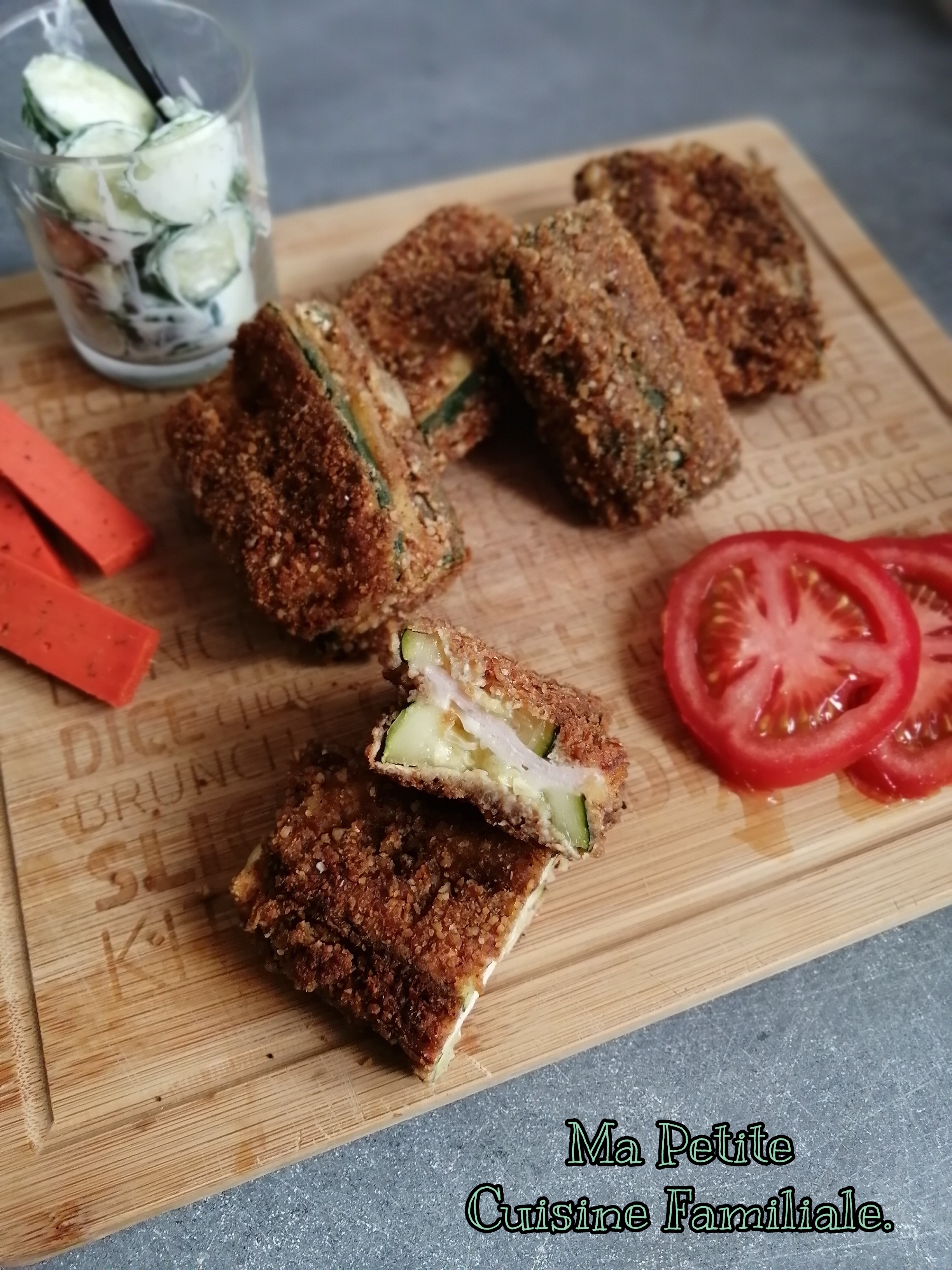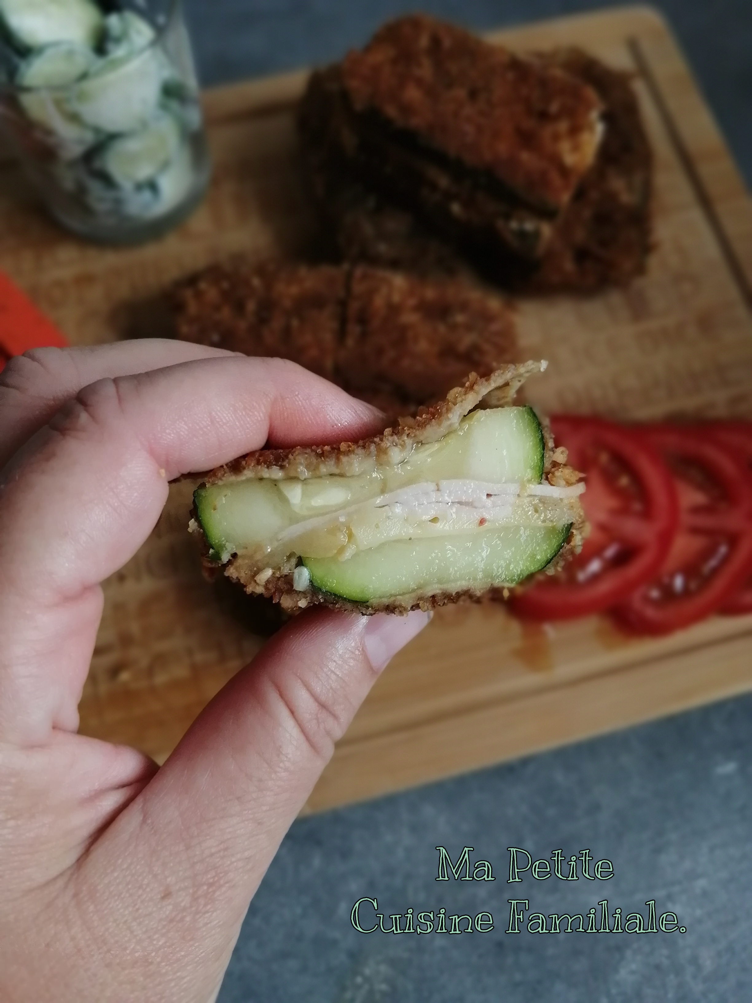 Il suffit de faire cuire des bandes de courgettes à la vapeur, de glisser entre 2 bandes, du jambon, du fromage. De paner le tout avec une panure de votre choix, pour moi, de la bretzel mais une autre fonctionne aussi, pourquoi pas de la panure mélangée à du parmesan, des corn flakes, etc…