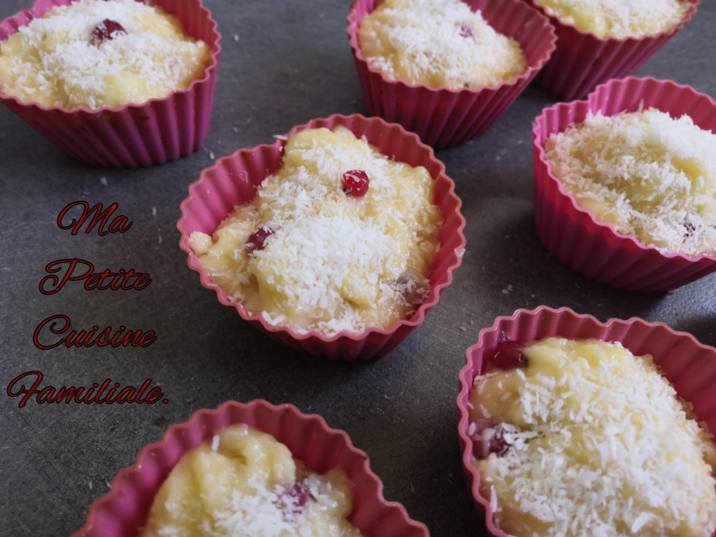 Remplissez les caissettes à muffins au 3/4. Couvrez le haut des muffins de coco râpée.