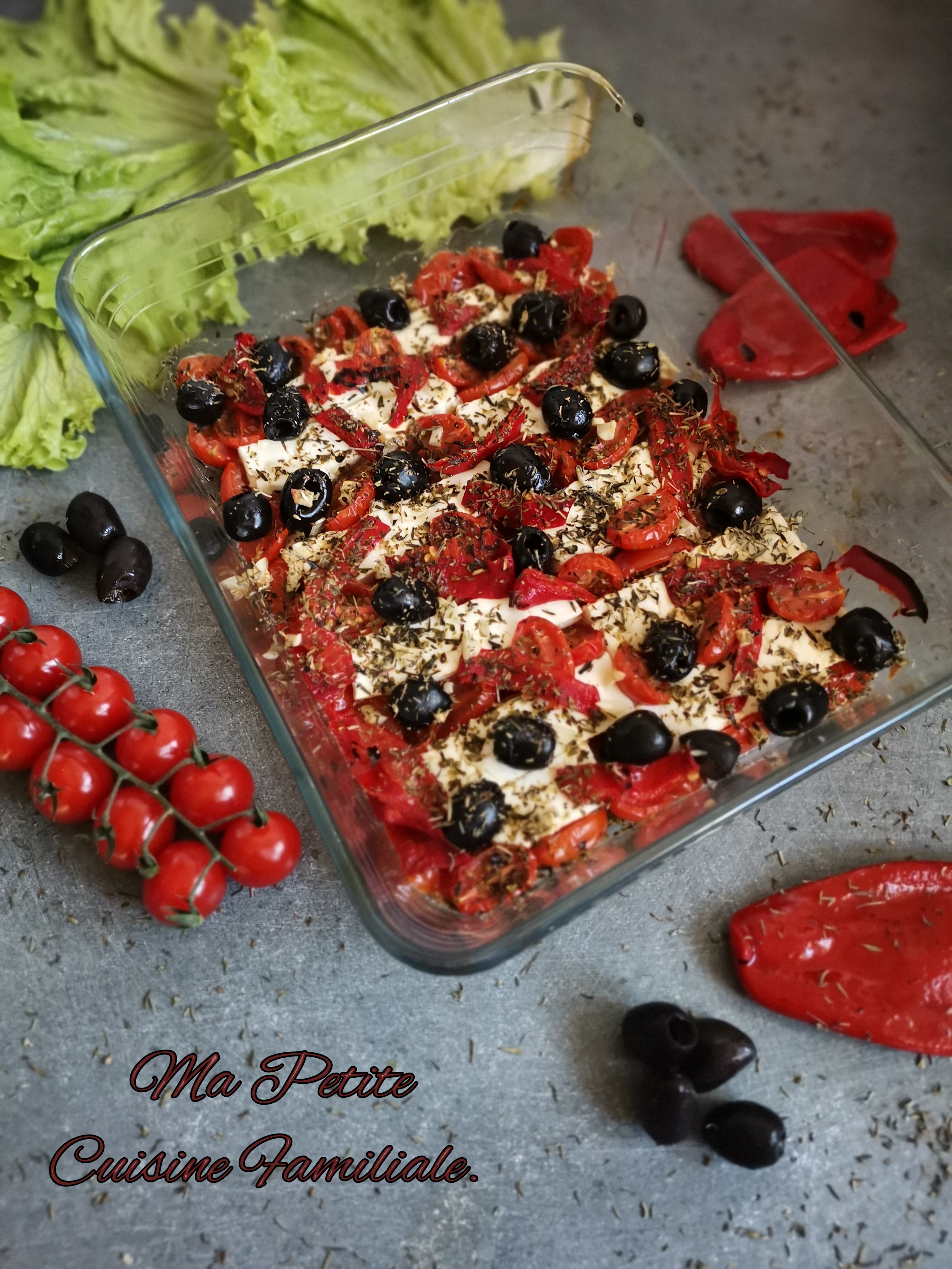 Pour profiter encore un peu des tomates, j’ai voulu tester une recette sur laquelle je suis tombée il y a peu. Une recette qui allie plusieurs de mes ingrédients préférés, les tomates, la fêta, les olives noires et les poivrons marinés, le tout arrosé d’un généreux filet d’huile d’olive. Le plat cuit doucement au four, il est prêt en peu de temps.