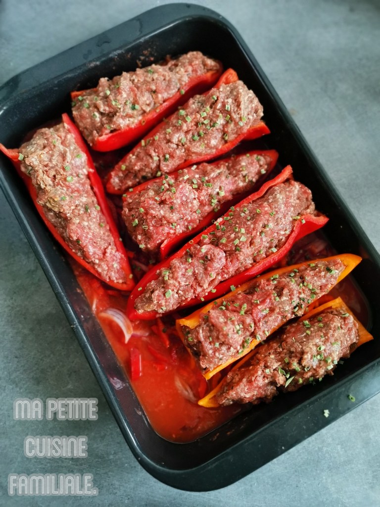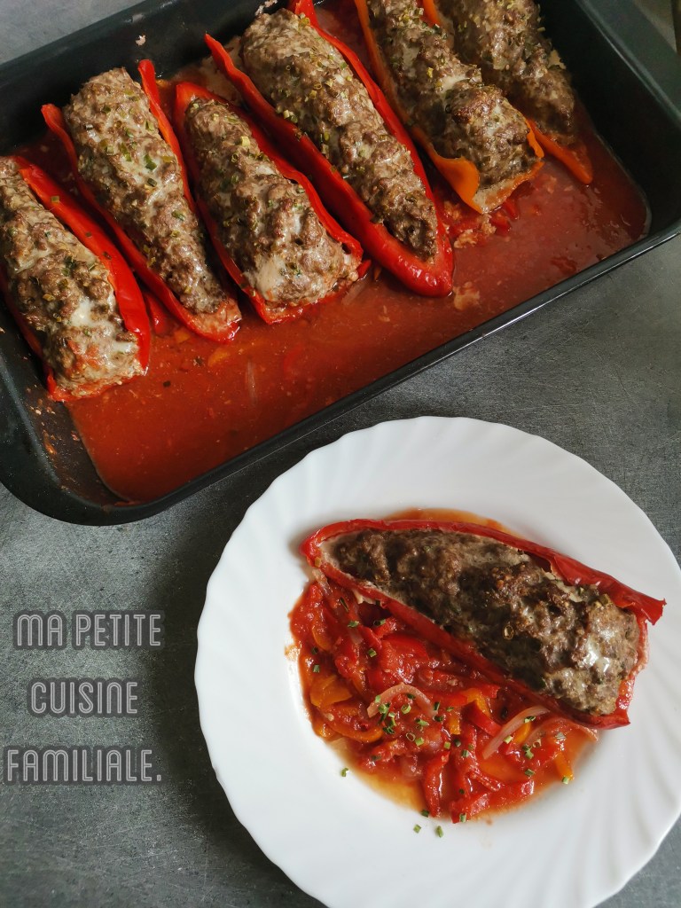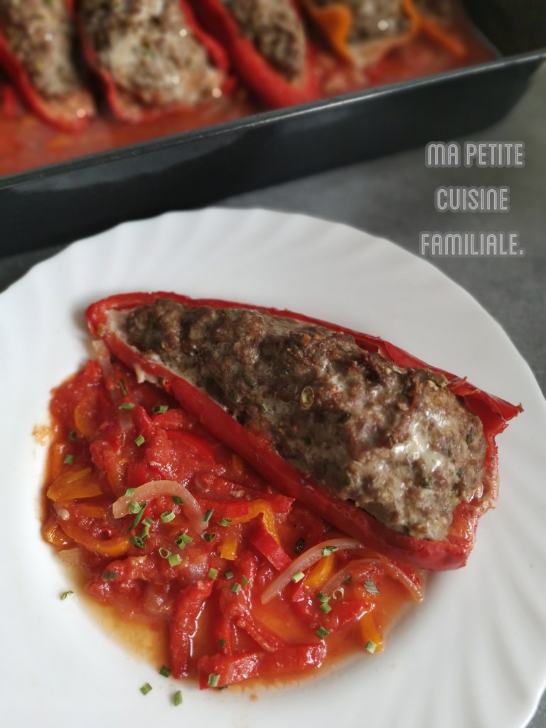 Pour le moment, je cuisine et je profite encore de quelques légumes estivaux. Les poivrons sont à l’honneur dans cette recette. De bons et beaux poivrons doux, légèrement sucrés, tout en longueur. Ils sont farcis de viande de bœuf hachée et posés sur un fond de poivrons et de tomates.