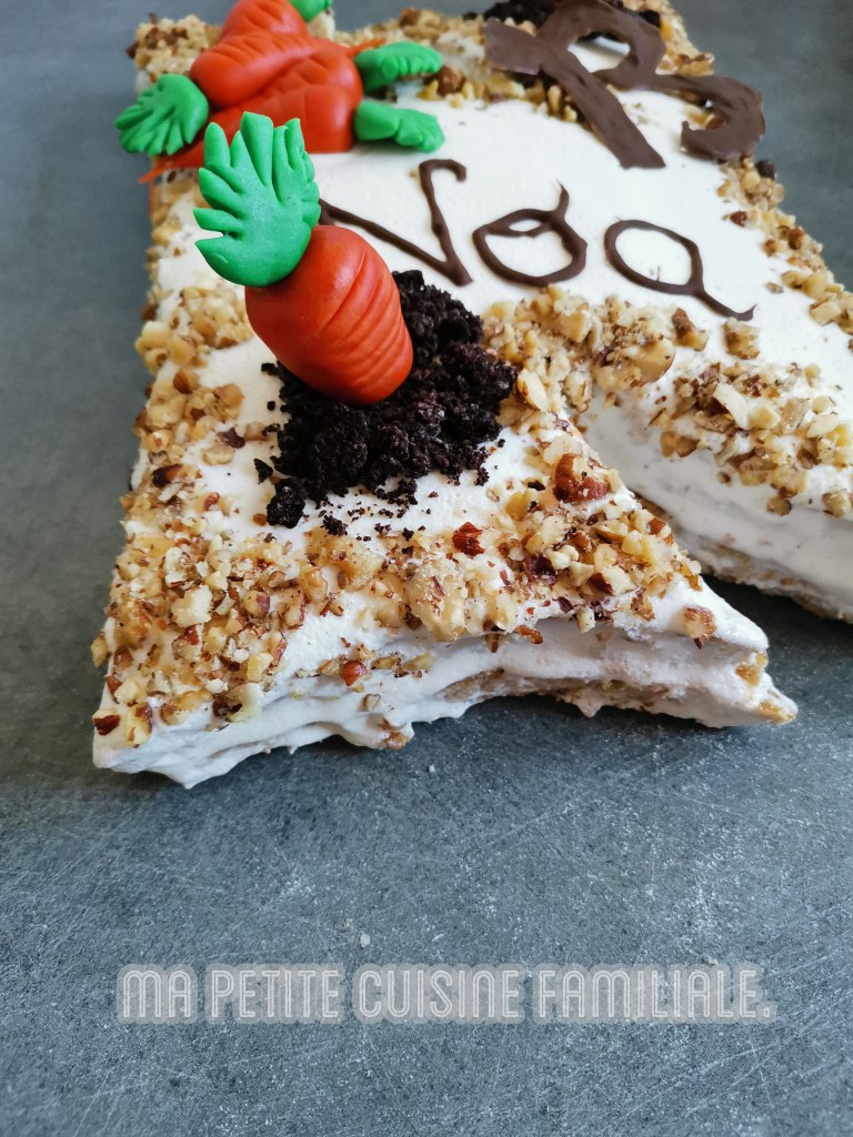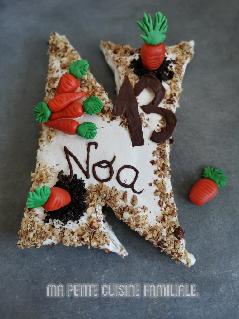 À part en muffins, je ne vous avais encore jamais proposé une recette de Carrot cake. C’est pourtant un gâteau que je fais régulièrement. Je profite donc de l’occasion pour rectifier le tir en vous proposant la recette de mon Carrot cake en forme de la lettre N. (N comme Noa)