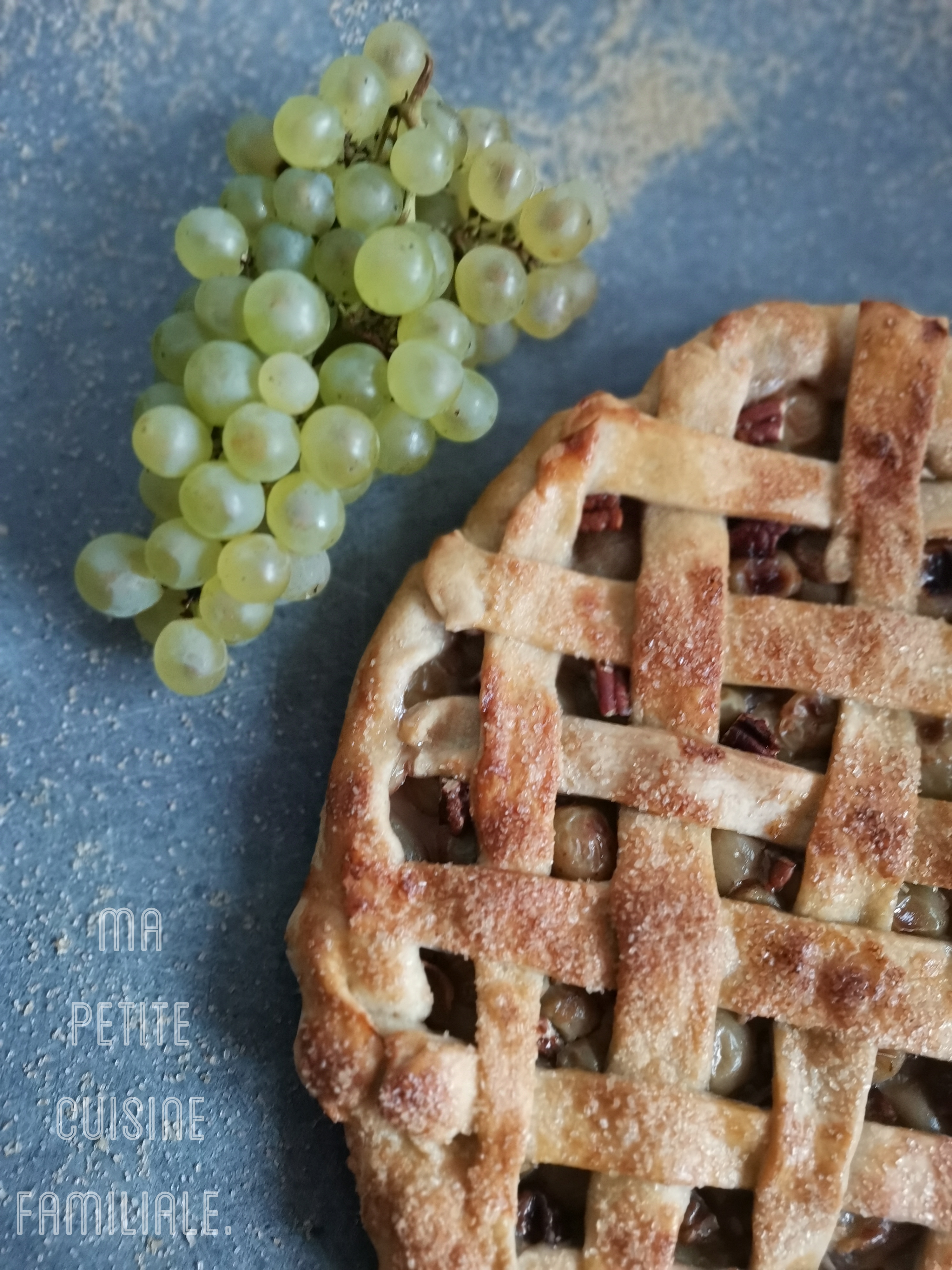 En attendant d’avoir ma propre vigne, je m’aprovisionne dans mon magasin le plus proche et je me suis achetée de belles grappes de chasselas la semaine dernière. J’en ai réservé une belle pour préparer une belle tarte grillée au raisin et à la noix de pécan.