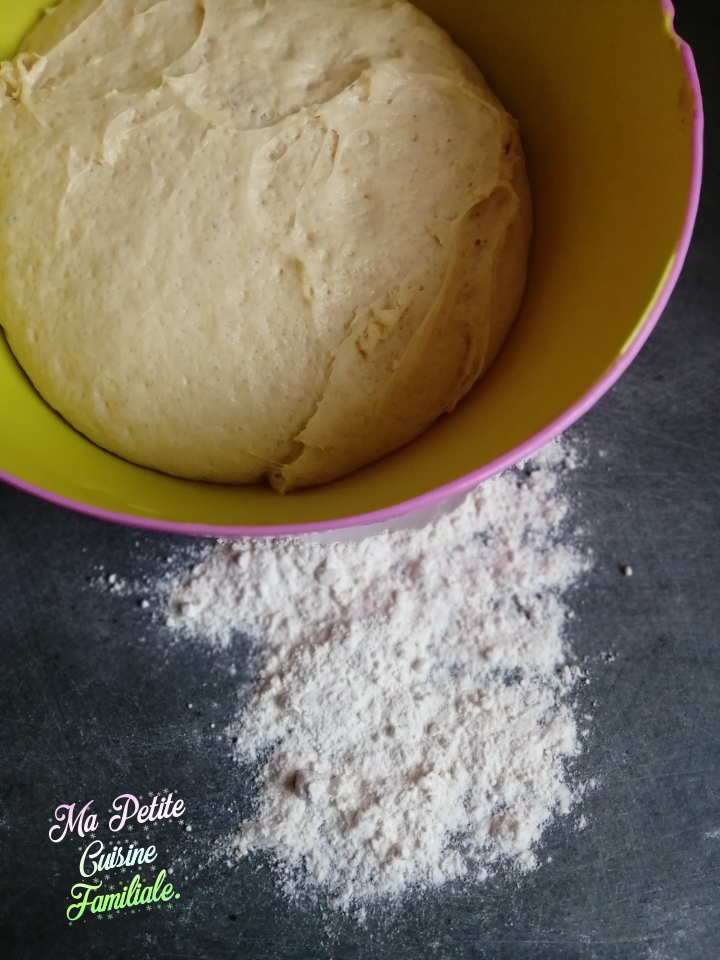 Pétrissez les ingrédients pendant au moins 15 minutes, ou jusqu’à ce que la pâte se détache des bords du saladier. Filmez le saladier et placez-le dans un endroit chaud. Évitez les courants d’air. Personnellement je place le saladier près d’un radiateur. Laissez lever la pâte 1h30 environ.