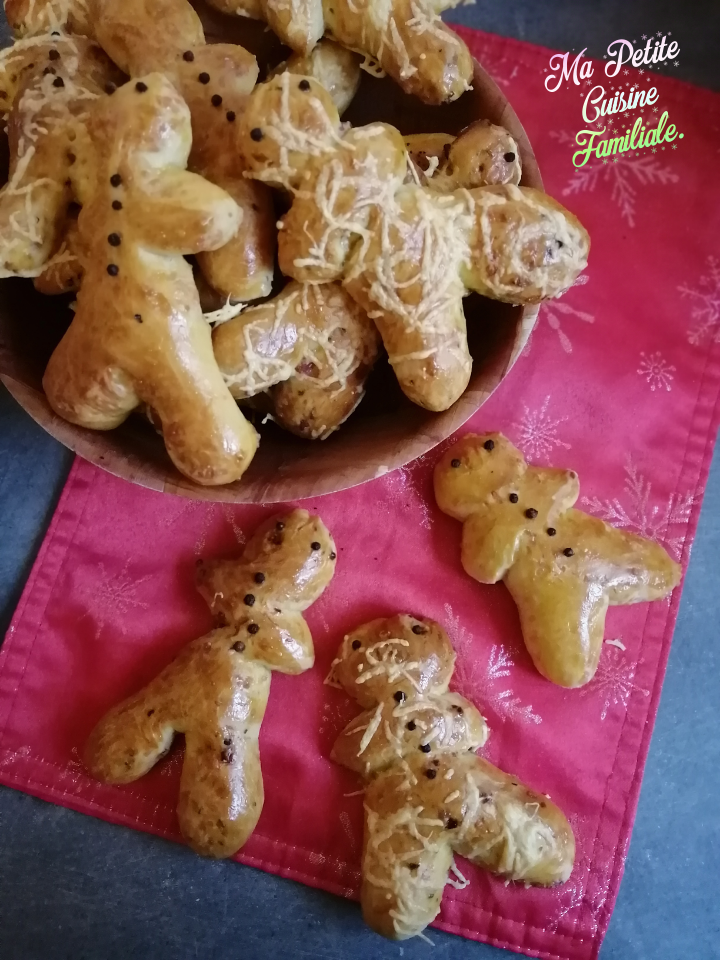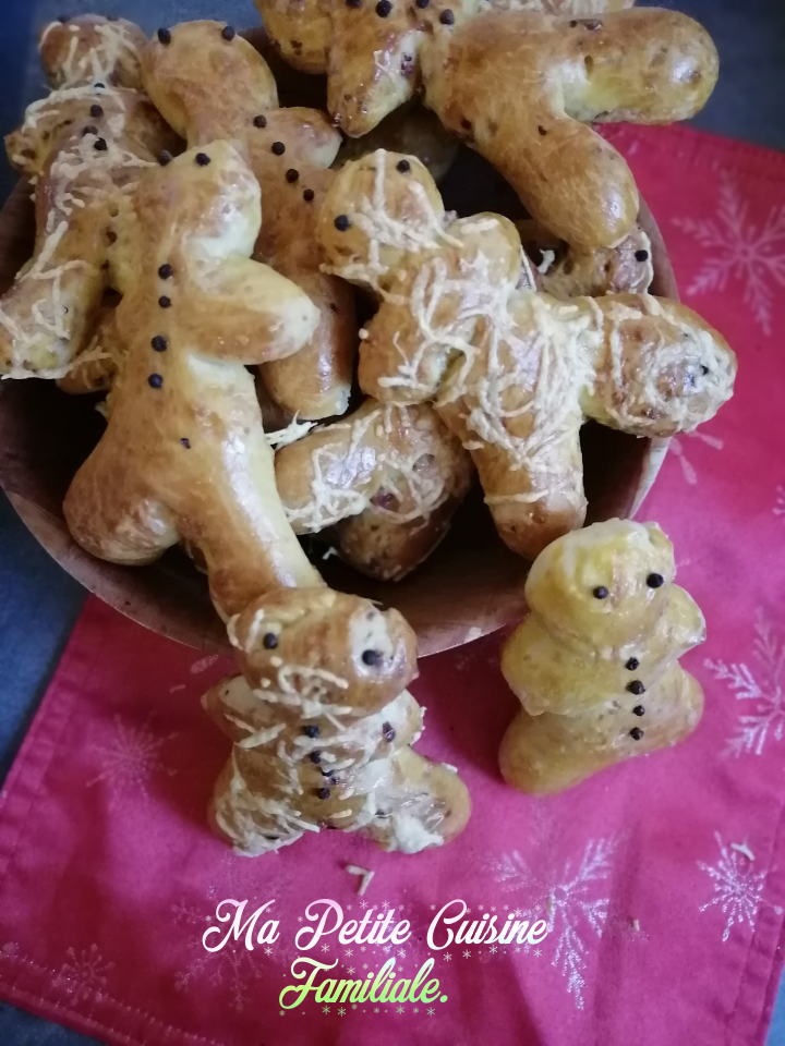 Une fois les maneles levés, dorez-les avec du jaune d’oeuf et placez des grains de poivre pour faire les traits du visage et les boutons. Saupoudrez de gruyère râpé si vous le désirez.