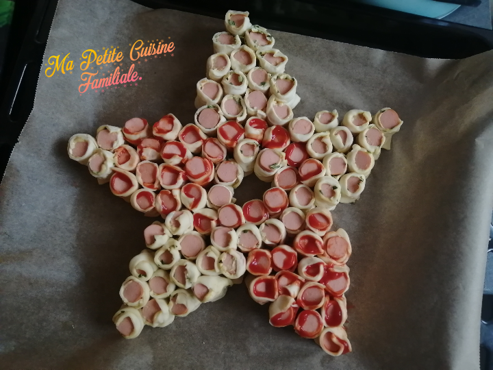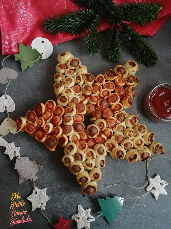 On peut les grignoter à l’apéritif. Comme je vous l’ai déjà proposé sur le blog, on peut aussi faire un feuilleté en forme d’étoile. Une grande étoile à partager, décortiquer, entre convives. Des morceaux de feuilleté que vous pourrez tremper dans le dip de votre choix. Mes enfants, aiment l’indétronable ketchup ou la sauce barbecue.