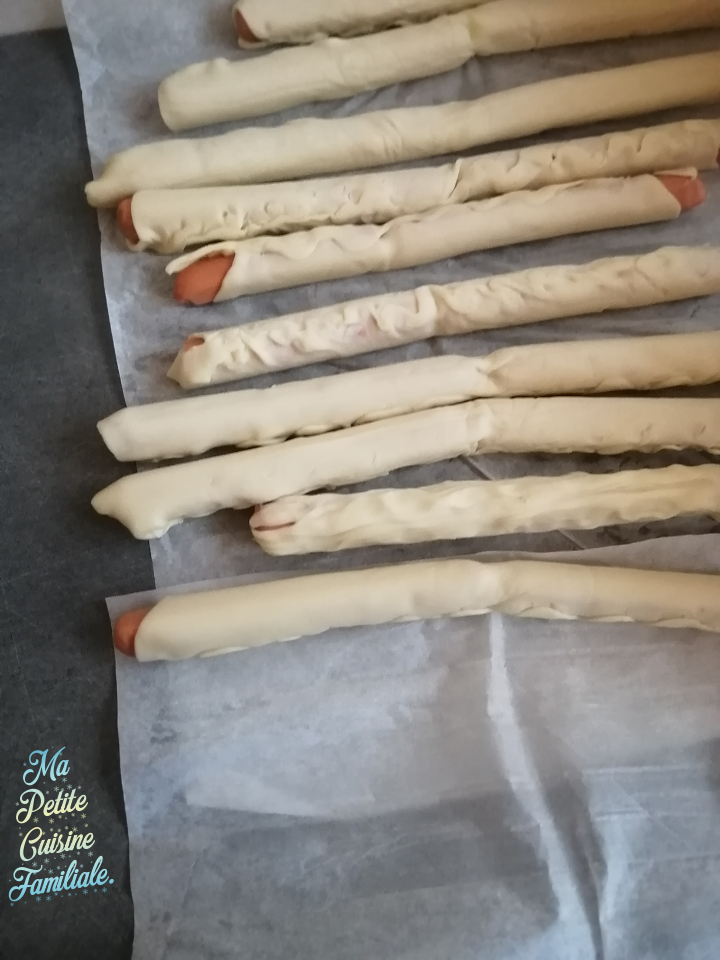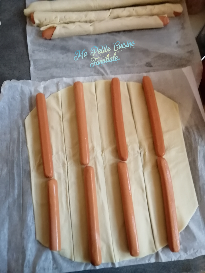 Ce feuilleté se compose de pâte feuilletée, de knacks de Strasbourg, de moutarde, de ketchup, de quelques herbes aromatiques.