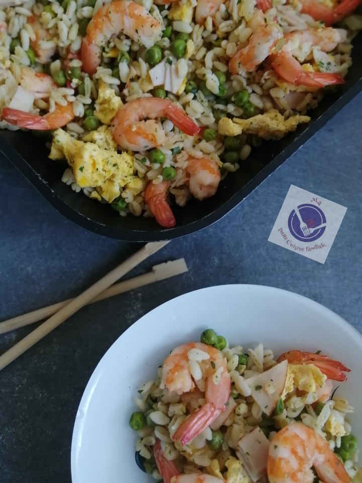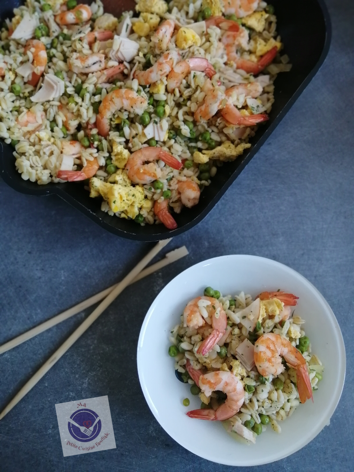 Réconciliation. C’est le fin mot de l’histoire. Je me suis inspirée très très largement du riz cantonnais très apprécié par la marmaille, pour réaliser ce plat et enfin les réconcilier avec ce blé qui envahissait depuis trop longtemps mon étagère.