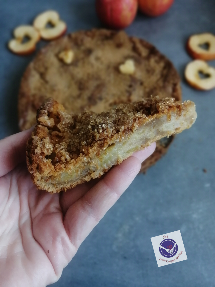Sa texture me rappelle le gâteau invisible aux pommes dont nous raffolons. Sa croûte croustillante craque sous la dent. Attention à ceux qui ne sont pas des becs sucrés comme moi, je me suis vite lassée du goût de sucre. Par contre le gâteau, un régal ! Mes enfants… dois-je nécessairement le rappeler…ont dévoré ce gâteau dont il n’est rapidement resté aucune miette.