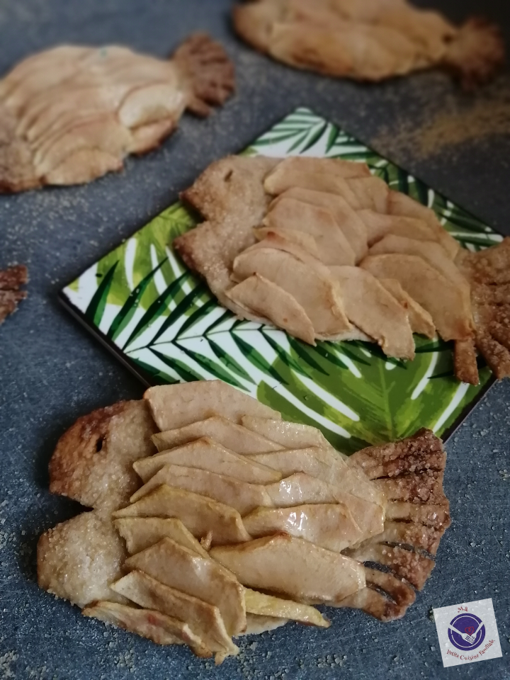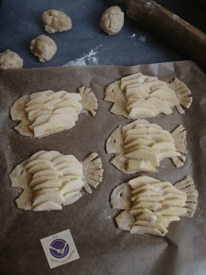 Pour cette recette, j’ai utilisé ma pâte maison habituelle à laquelle j’ai rajouté de la cannelle en poudre. Un peu de sucre cassonade sur la tête et la queue, des fines lamelles de pommes et nous voilà avec un goûter gourmand et vite prêt.