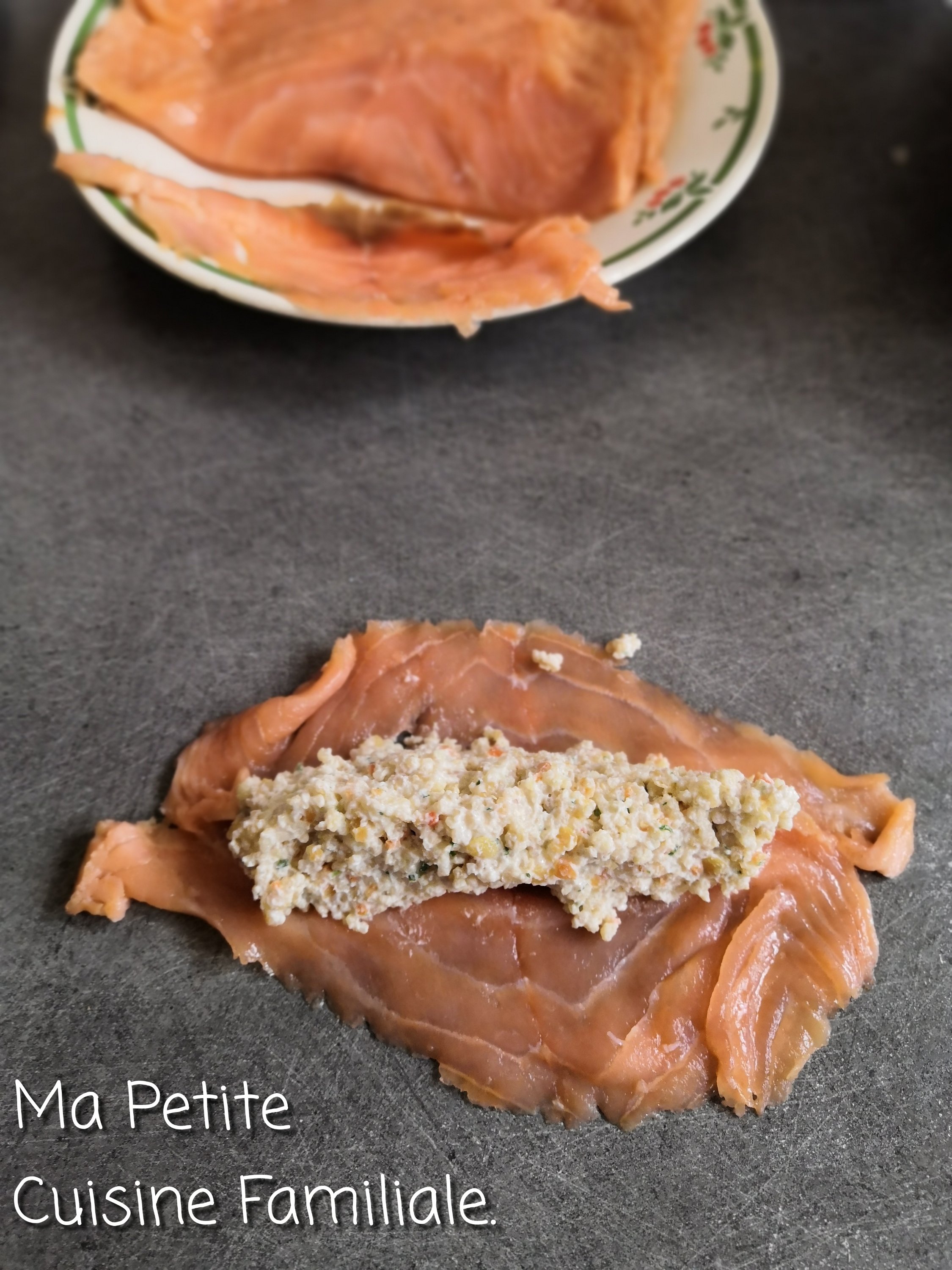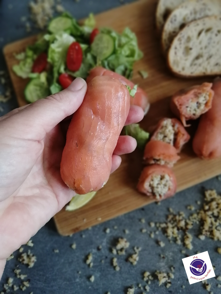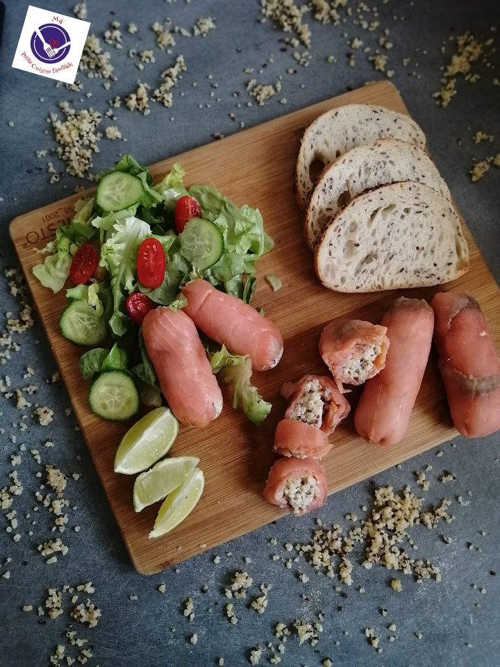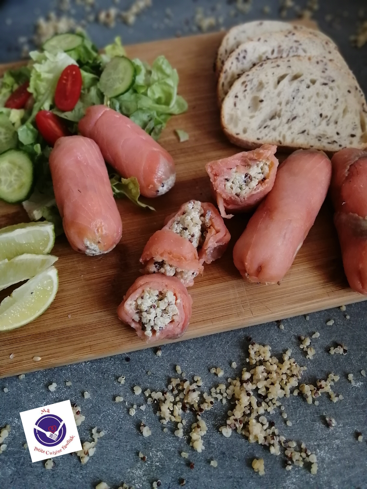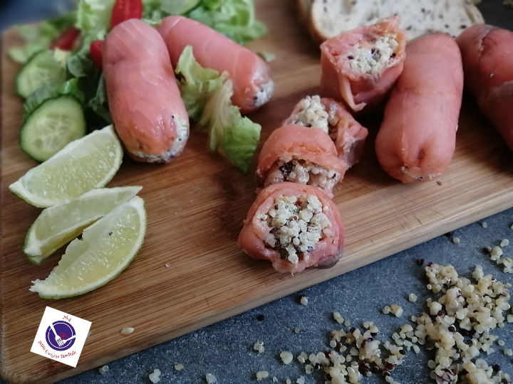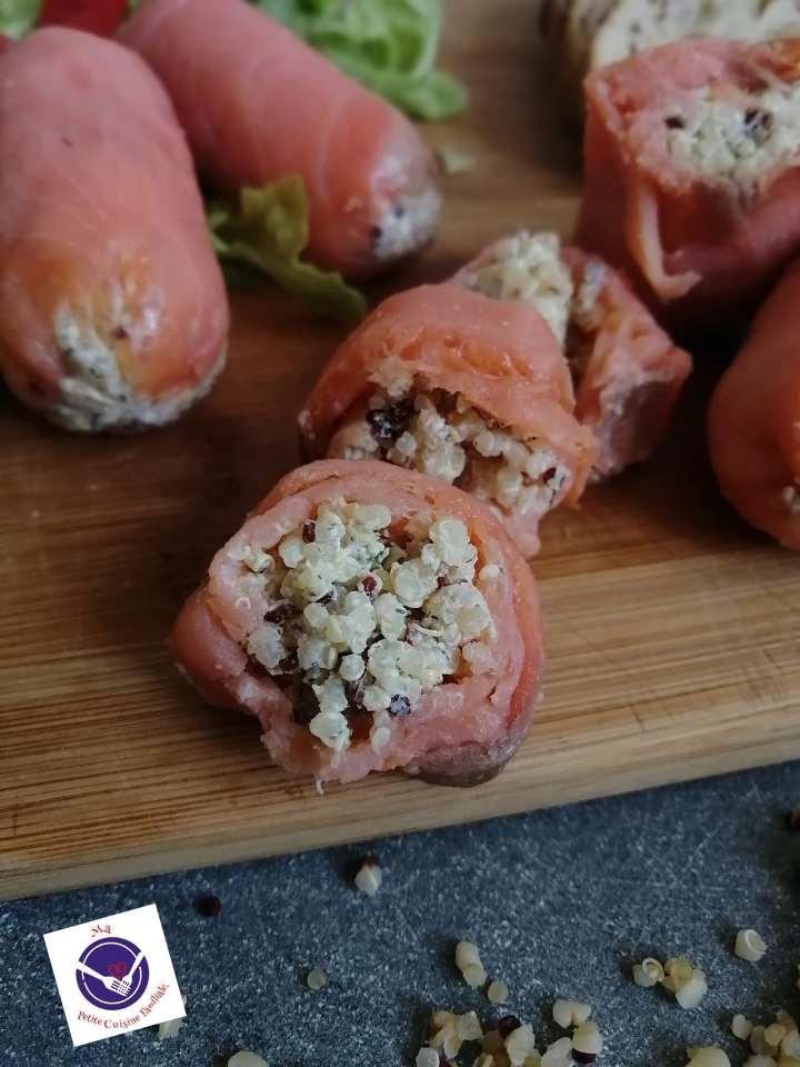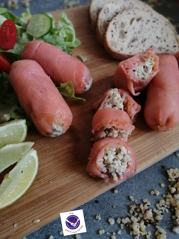 Ces petits rouleaux de saumon fumé farcis de quinoa ont été créé en premier lieu pour utiliser un reste de quinoa/boulghour cuit dont les enfants ne voulaient plus.