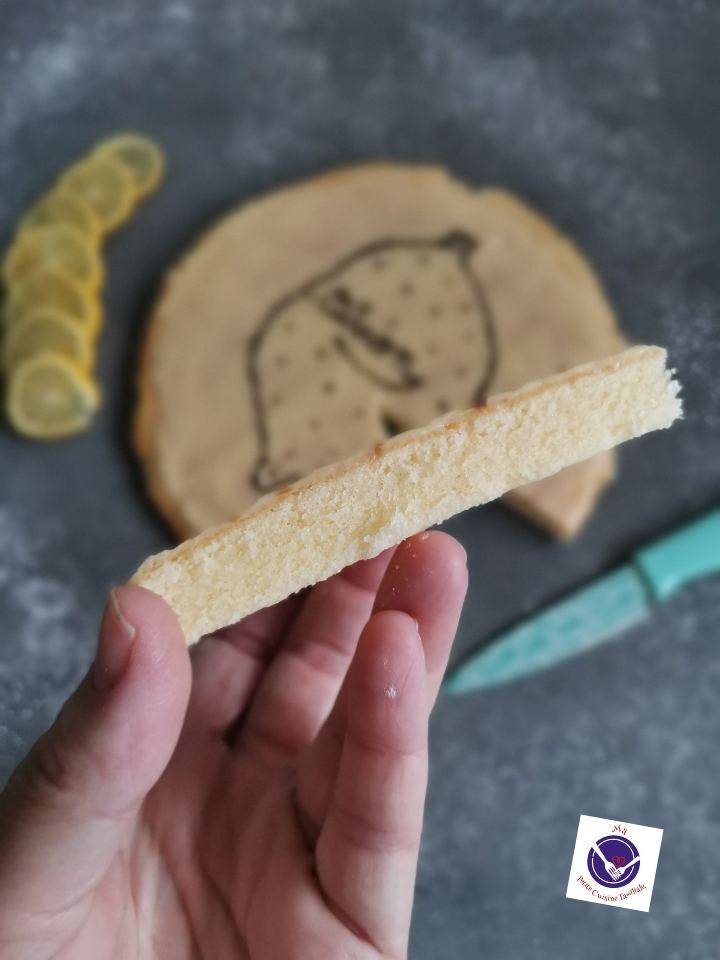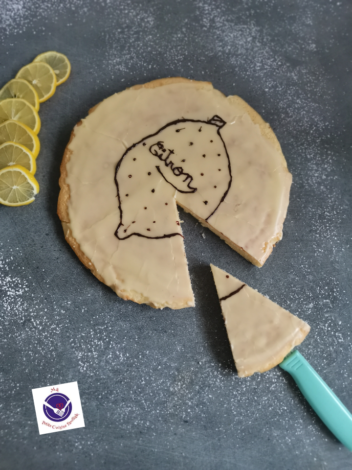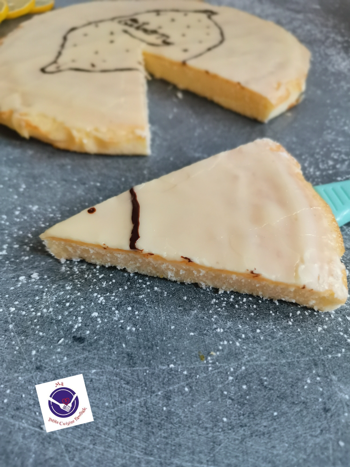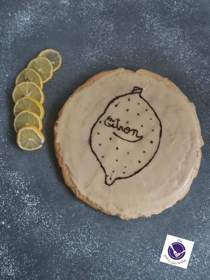Je l’ai glacé avec un peu de glaçage au sucre glace coloré avec quelques gouttes de colorant alimentaire jaune. J’y ai dessiné un citron avec du chocolat fondu.