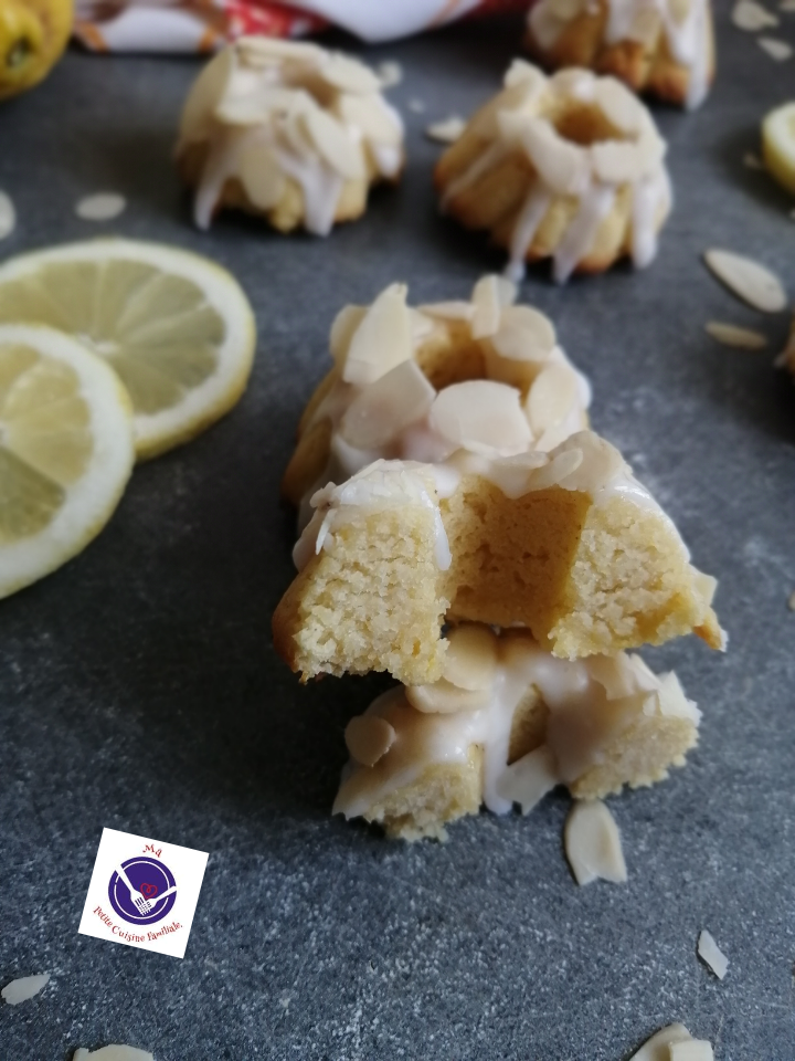 J’ai utilisé des moules à minis kougelhopfs. J’ai finalisé cette recette en glaçant mes petits fondants d’un mélange sucre glace, jus de citron, puis décoré avec des amandes effilées.