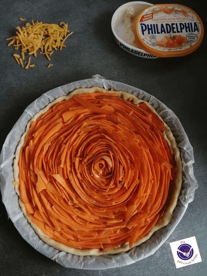 J’ai tartiné le fond de la tarte avec du fromage de la marque Philadelphia au saumon et aneth. Si par hasard, cette célèbre marque de fromage tombe sur le blog, je lance une bouteille à la mer. « j’aimerais tellement en trouver en France aussi », car j’ai découvert cette version en Allemagne et c’est délicieux. En France nous n’en trouvons malheureusement pas. En remplacement, vous pouvez tartiner votre fond de pâte de fromage à tartiner nature ou de fromage à tartiner aux noix.