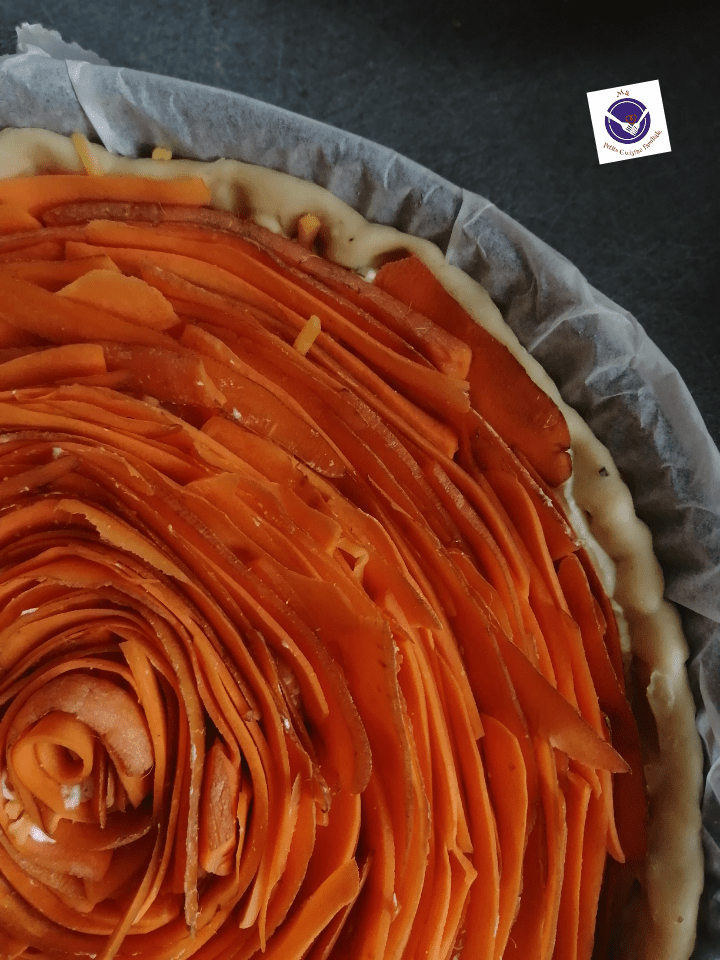Pour faire un effet spiral, il faut couper les carottes à l’économe. C’est un éplucheur et ça vous permettra d’avoir de très fines tranches de carottes. Vous pourrez ainsi les poser crues sur la pâte, elles cuiront tout de même.