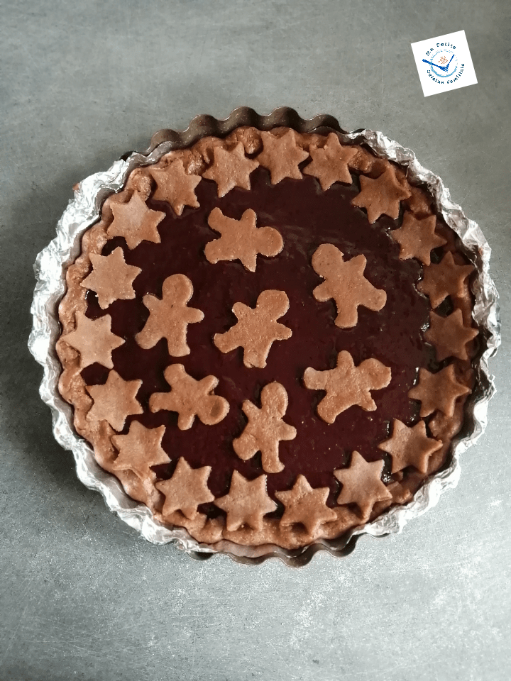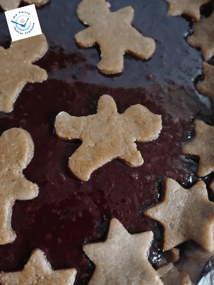 Les gens vivant dans l’Est de la France connaissent bien cette tarte faite de pâte sablé à l’amande… je privilégie la noisette, mais chuuut…et garnie de confiture. En général, elle est décorée d’un quadrillage de pâte. Je préfère l’habiller aux couleurs de Noël, avec des étoiles et des maneles. (petit personnage emblématique des Noëls alsaciens).