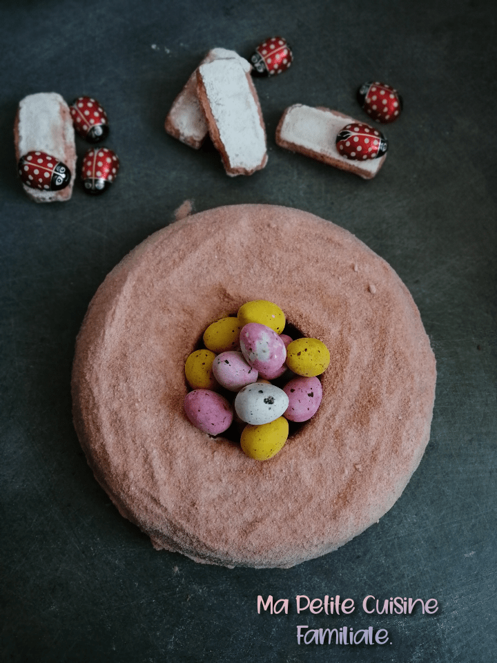Un bon gâteau de Pâques, un traditionnel nid. Celui-ci est certifié sans crème au beurre mais bourré de biscuits roses de Reims. Glacé au chocolat blanc et saupoudré de poudre de biscuits roses. J’ai utilisé un moule à Savarin pour lui donner une belle forme ronde et dans le trou au milieu, j’ai posé quelques œufs de mouettes au chocolat pour donner l’illusion d’un nid.
