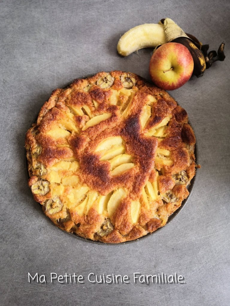 Pour le goûter ou le dessert, c’est un gâteau qui vous permettra d’utiliser des bananes trop mûres et des pommes un peu flétries. Par contre, le beurre n’y manque pas. Si vous cherchez du diététique, passez votre chemin.