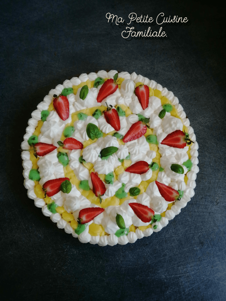 Une tarte étonnante à la crème de citron acidulée, à la chantilly mascarpone qui adoucit le tout, à la crème de basilic qui donne du peps. Le tout reposant sur un plat breton et orné de fraises fraîches.