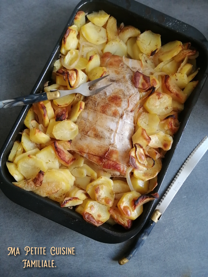 Pommes de terre et pommes golden entourent un beau rôti. Le tout cuit lentement au four dans du cidre.