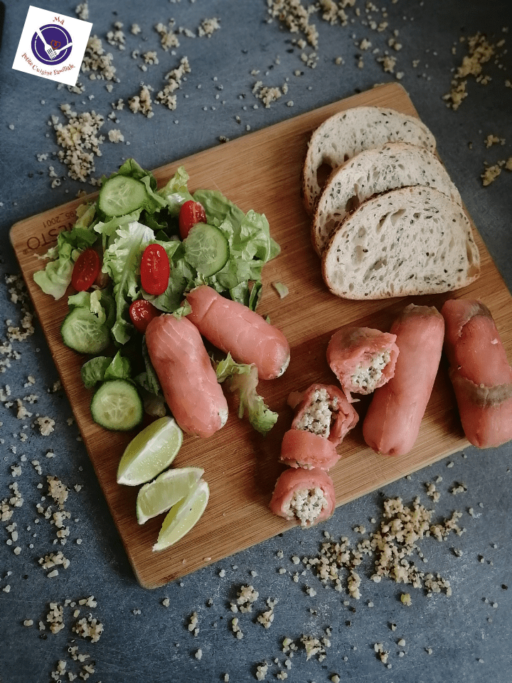 Sympa pour une entrée froide ou en plat accompagné de crudités. Cette recette m’est née d’un reste de quinoa qui trainait dans mon frigo. J’ai alors réalisé une jolie farce et garni une tranche de saumon fumé que j’ai roulé sur elle-même.