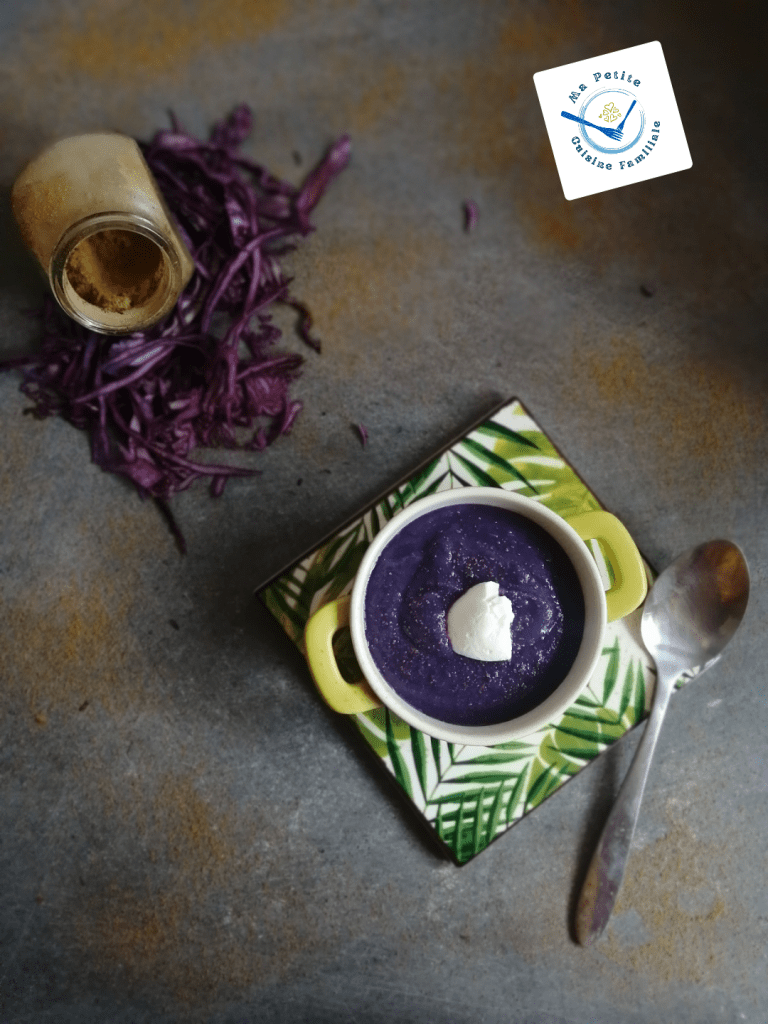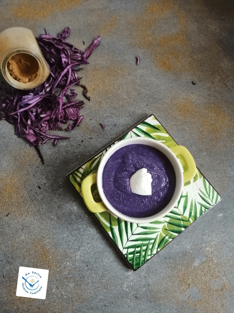 Le chou rouge, comme l’ensemble des choux, n’attire pas vraiment les papilles de mes enfants. Ils n’aiment pas ce légume. Le cuire simplement en lamelles avec des pommes et des châtaignes ne suffit pas à les faire saliver. Puisqu’ils aiment les tartes salées et les quiches, j’ai déjà essayé de leur faire aimer ce légume avec une délicieuse tarte rustique, mais rien y a fait. Je me souviens qu’ils n’ont même pas voulu y goûter. Ma dernière chance, un velouté tout doux. J’ai tout misé sur sa belle couleur mauve…